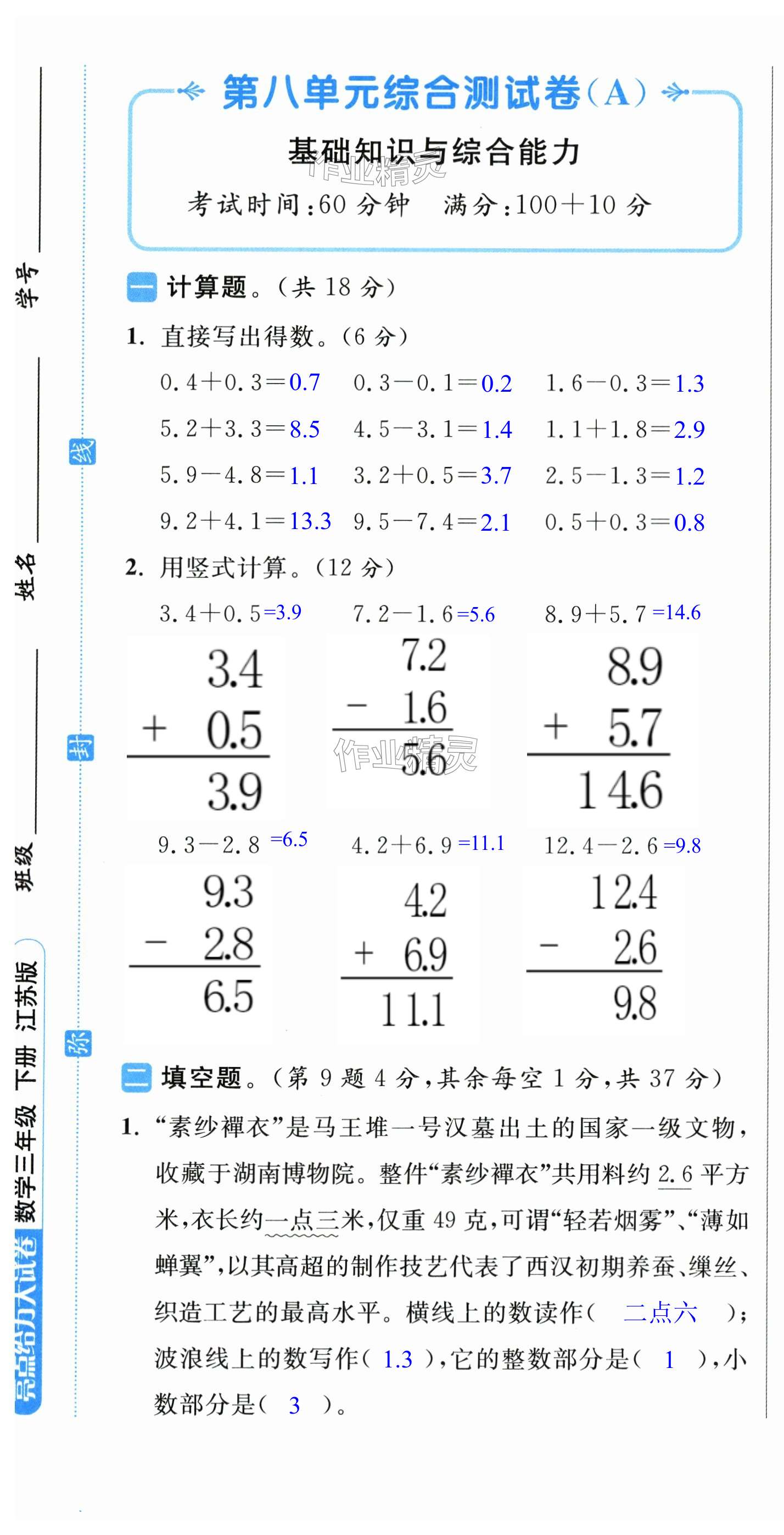 注:目前有些书本章节名称可能整理的还不是很完善,但都是按照顺序排列的,请同学们按照顺序仔细查找。练习册 2024年亮点给力大试卷三年级数学下册苏教版 答案主要是用来给同学们做完题方便对答案用的,请勿直接抄袭。
