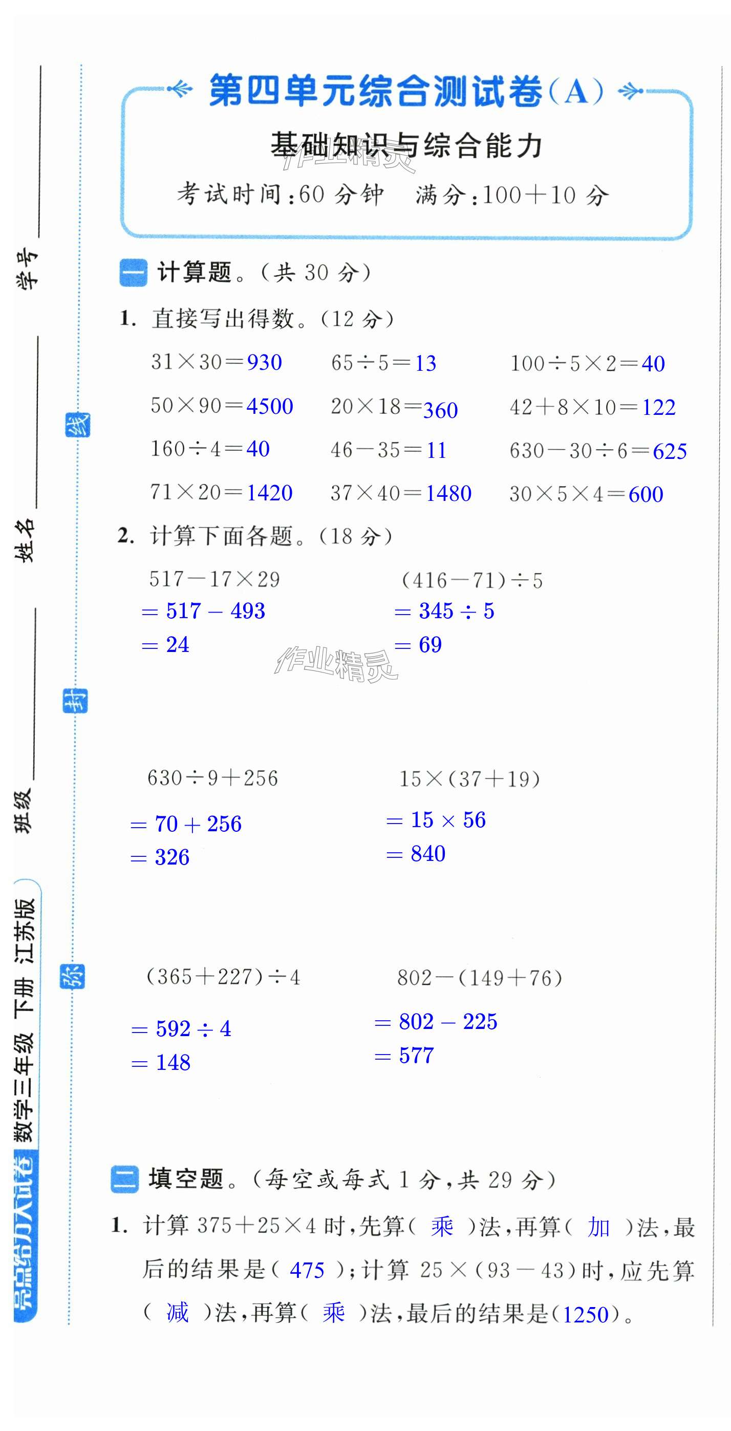 注:目前有些书本章节名称可能整理的还不是很完善,但都是按照顺序排列的,请同学们按照顺序仔细查找。练习册 2024年亮点给力大试卷三年级数学下册苏教版 答案主要是用来给同学们做完题方便对答案用的,请勿直接抄袭。