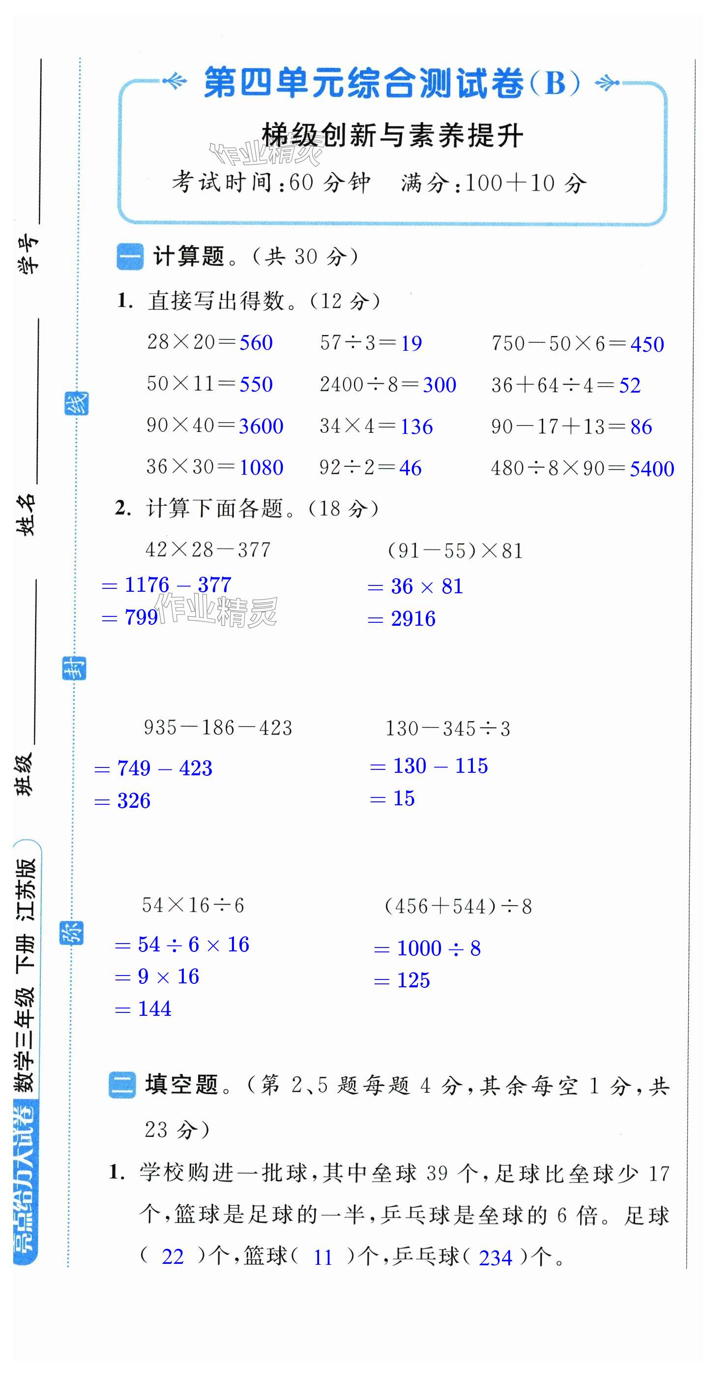 注:目前有些书本章节名称可能整理的还不是很完善,但都是按照顺序排列的,请同学们按照顺序仔细查找。练习册 2024年亮点给力大试卷三年级数学下册苏教版 答案主要是用来给同学们做完题方便对答案用的,请勿直接抄袭。
