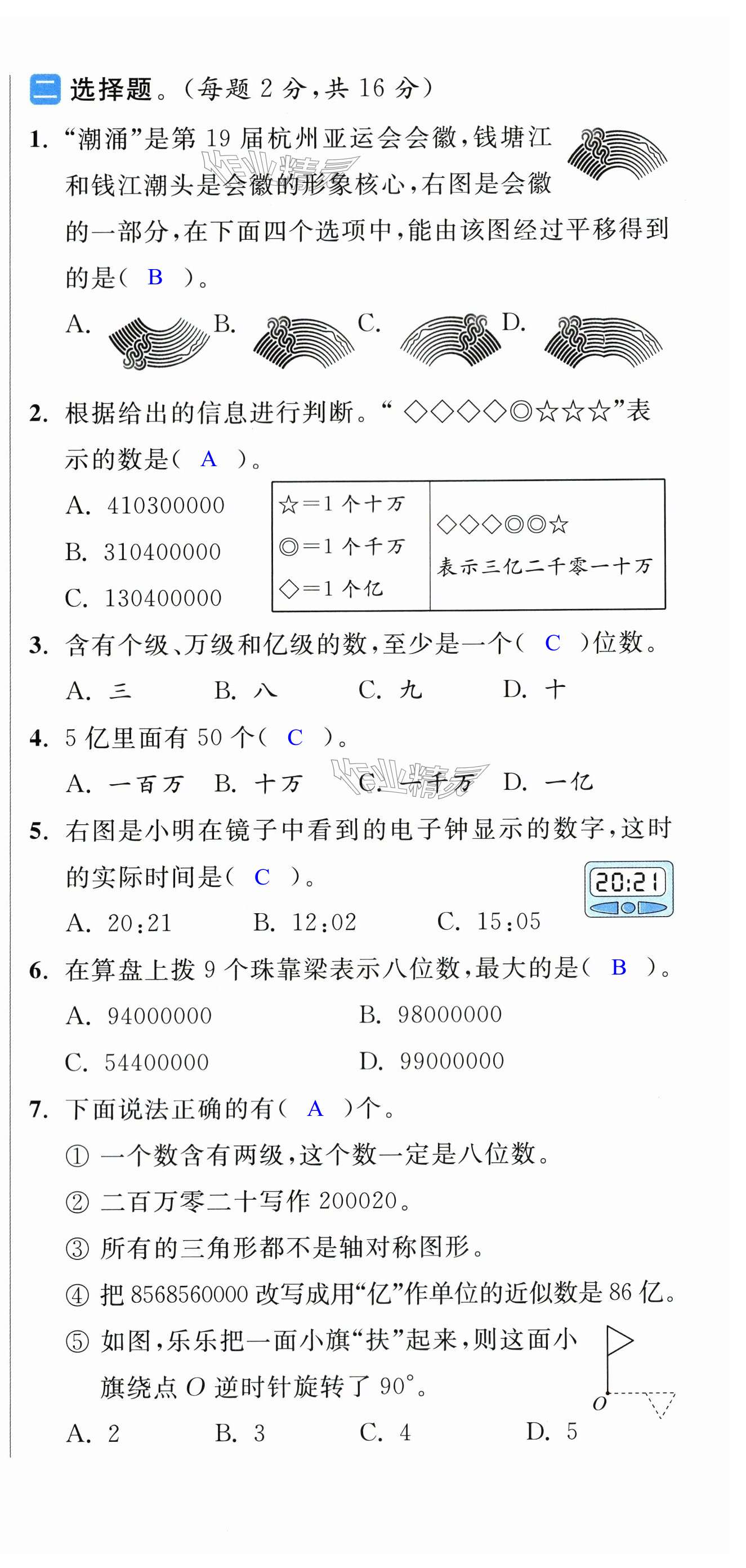 注:目前有些书本章节名称可能整理的还不是很完善,但都是按照顺序排列的,请同学们按照顺序仔细查找。练习册 2024年亮点给力大试卷四年级数学下册苏教版 答案主要是用来给同学们做完题方便对答案用的,请勿直接抄袭。