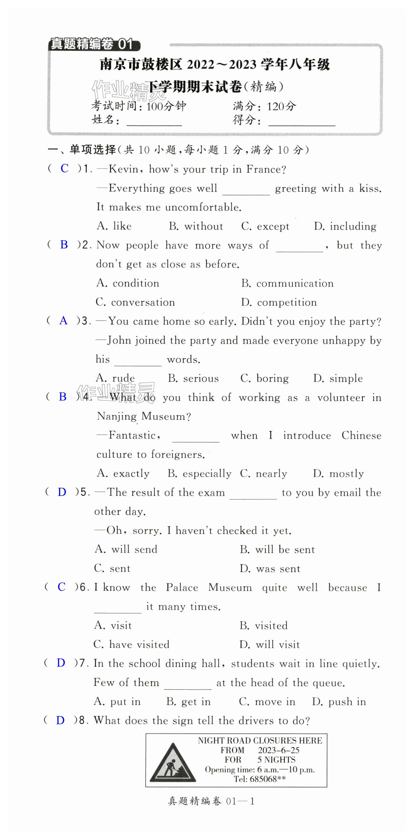 注:目前有些书本章节名称可能整理的还不是很完善,但都是按照顺序排列的,请同学们按照顺序仔细查找。练习册 2024年学霸提优大试卷八年级英语下册译林版 答案主要是用来给同学们做完题方便对答案用的,请勿直接抄袭。
