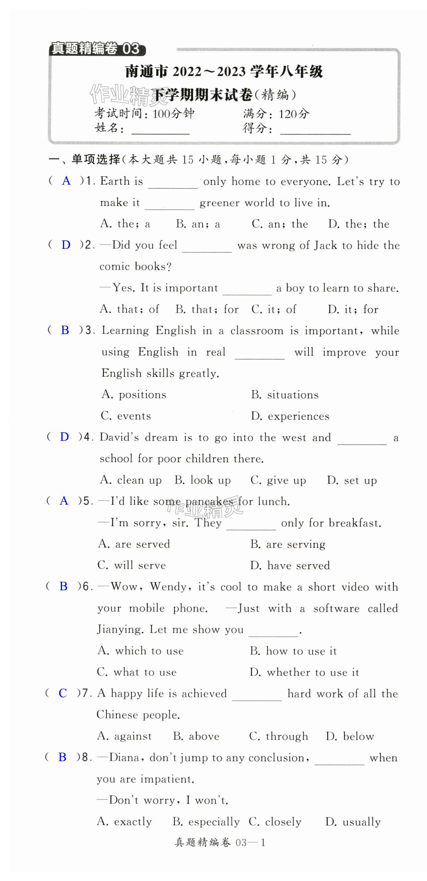 注:目前有些书本章节名称可能整理的还不是很完善,但都是按照顺序排列的,请同学们按照顺序仔细查找。练习册 2024年学霸提优大试卷八年级英语下册译林版 答案主要是用来给同学们做完题方便对答案用的,请勿直接抄袭。