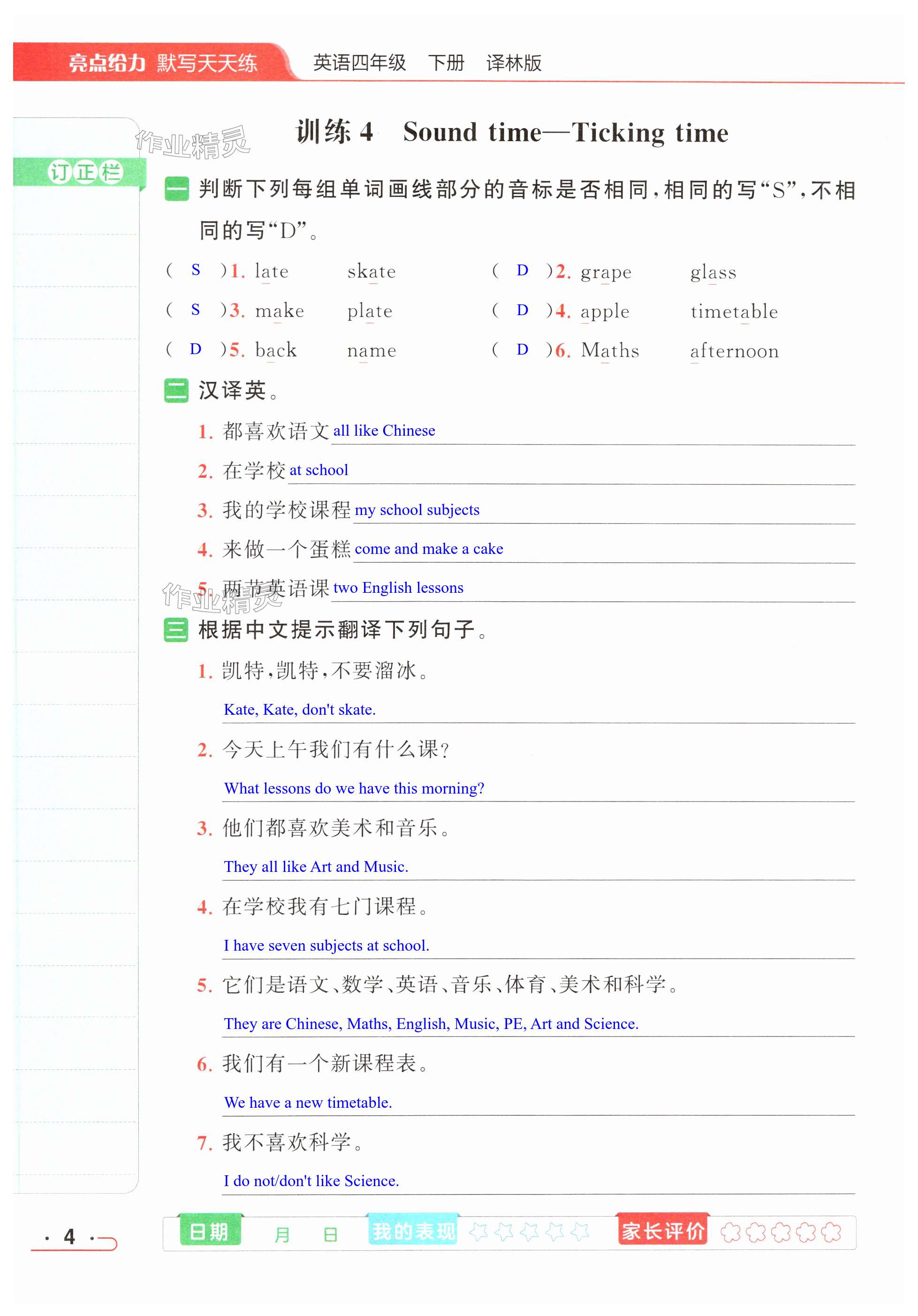 《2024年亮点给力默写天天练四年级英语下册译林版》