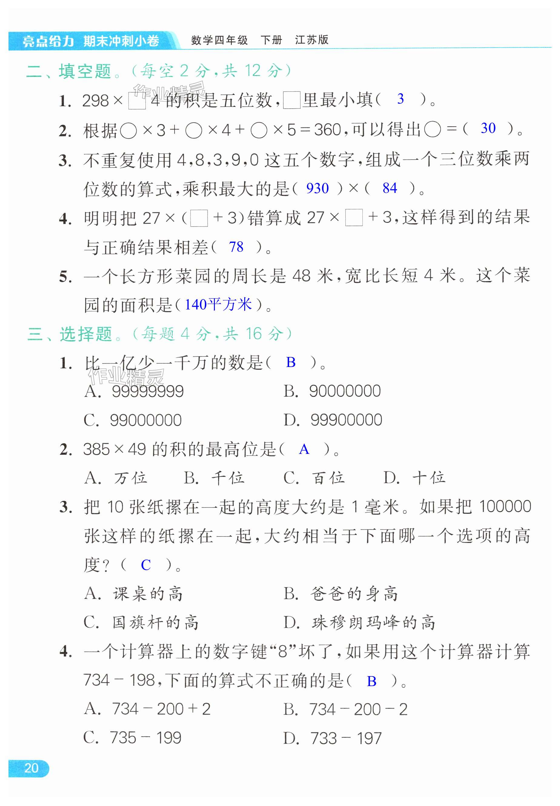 注:目前有些书本章节名称可能整理的还不是很完善,但都是按照顺序排列的,请同学们按照顺序仔细查找。练习册 2024年亮点给力计算天天练四年级数学下册苏教版 答案主要是用来给同学们做完题方便对答案用的,请勿直接抄袭。