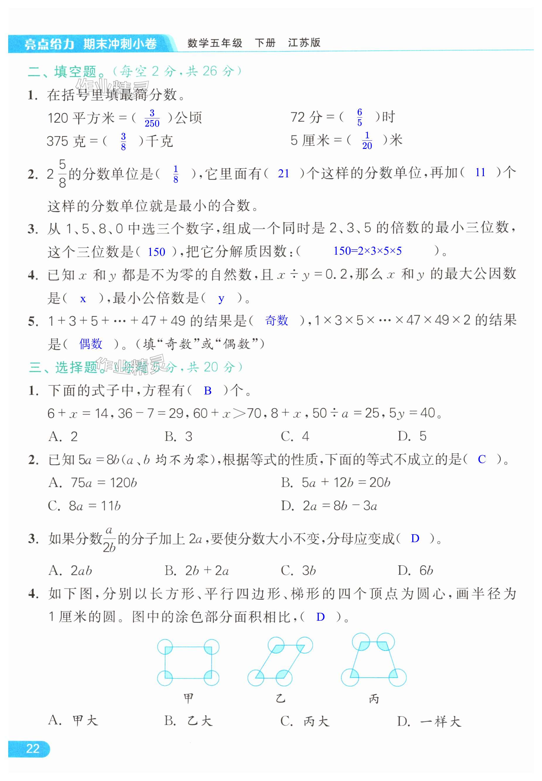 注:目前有些书本章节名称可能整理的还不是很完善,但都是按照顺序排列的,请同学们按照顺序仔细查找。练习册 2024年亮点给力计算天天练五年级数学下册苏教版 答案主要是用来给同学们做完题方便对答案用的,请勿直接抄袭。