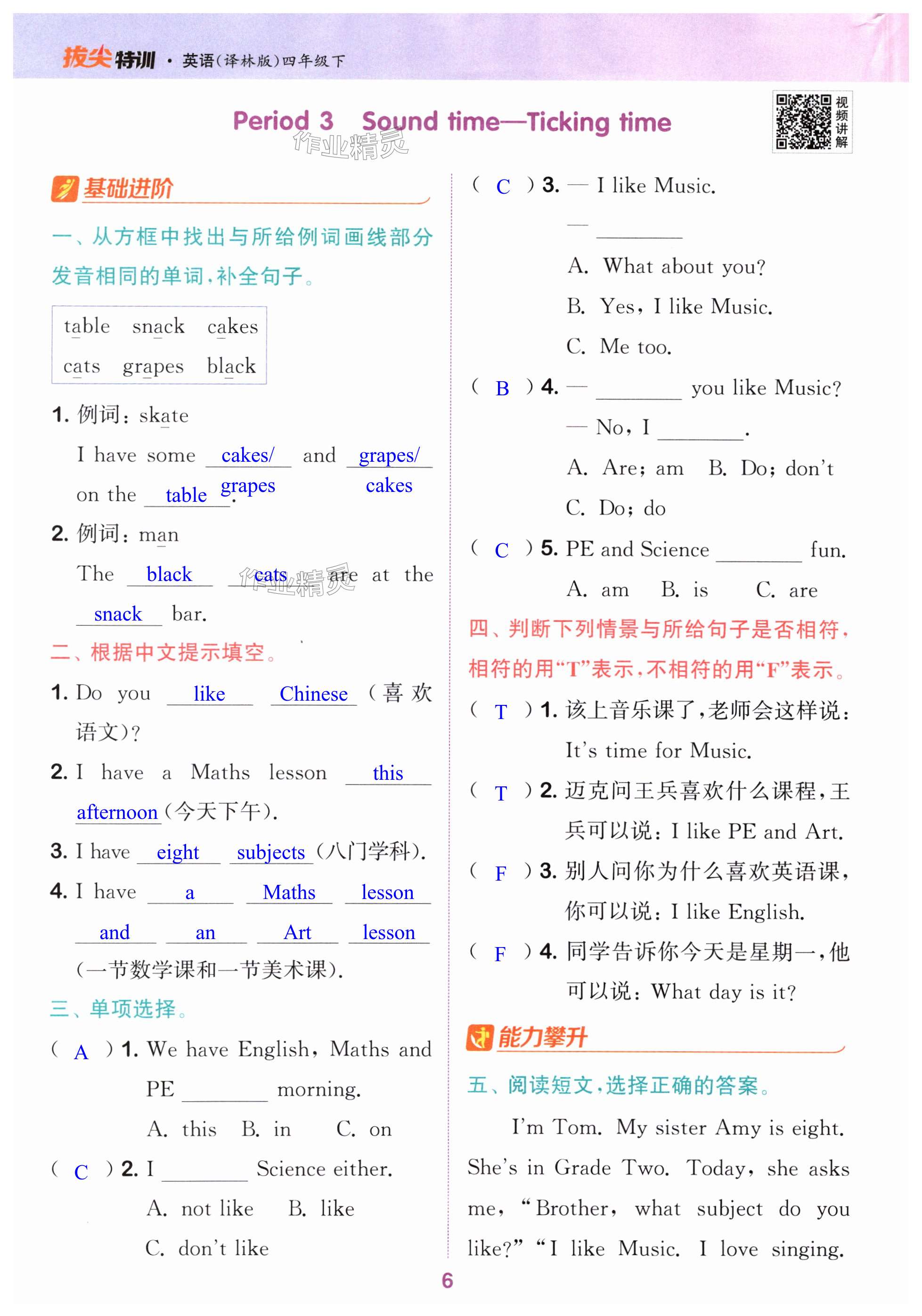注:目前有些书本章节名称可能整理的还不是很完善,但都是按照顺序排列的,请同学们按照顺序仔细查找。练习册 2024年拔尖特训四年级英语下册译林版 答案主要是用来给同学们做完题方便对答案用的,请勿直接抄袭。