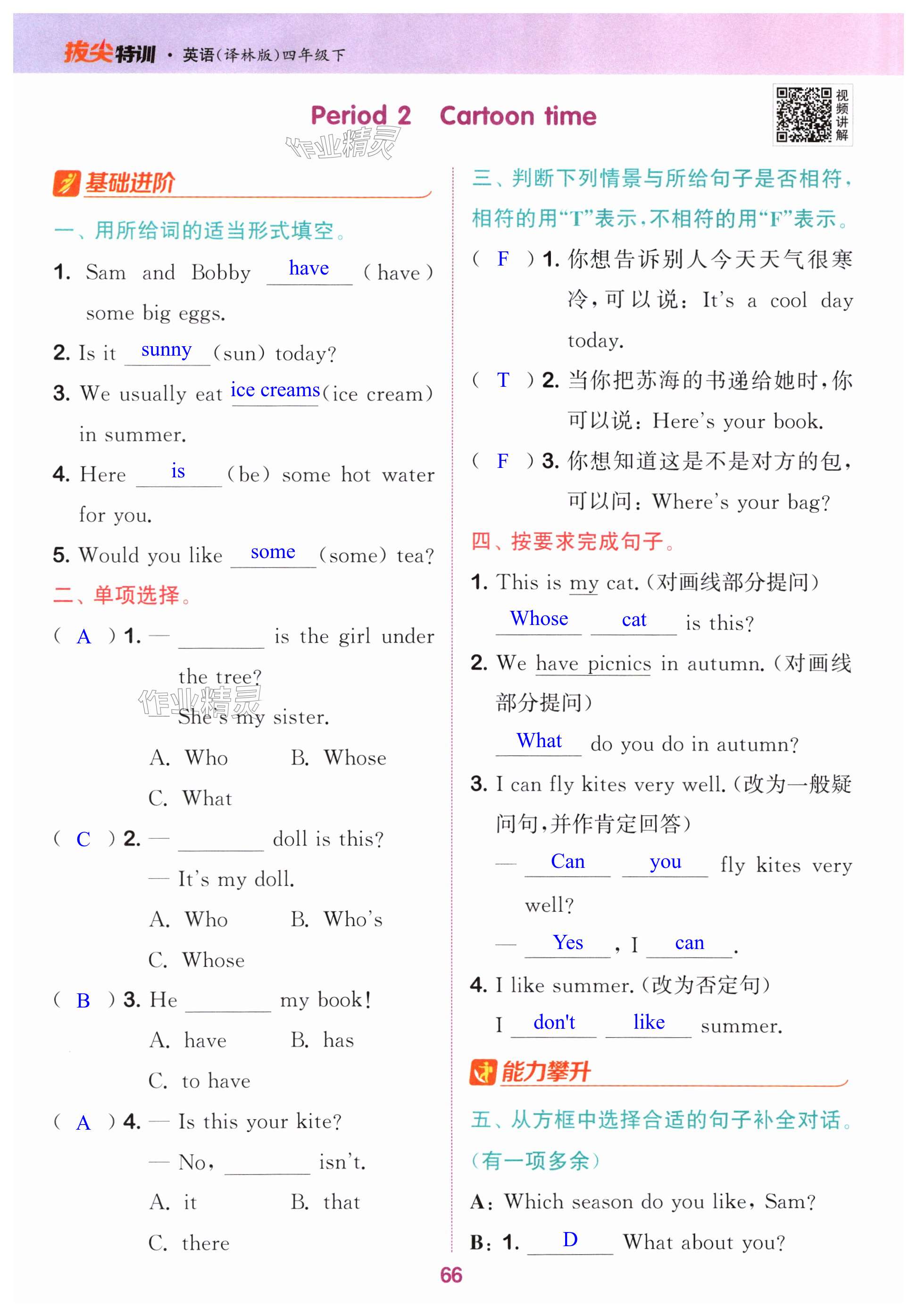 注:目前有些书本章节名称可能整理的还不是很完善,但都是按照顺序排列的,请同学们按照顺序仔细查找。练习册 2024年拔尖特训四年级英语下册译林版 答案主要是用来给同学们做完题方便对答案用的,请勿直接抄袭。