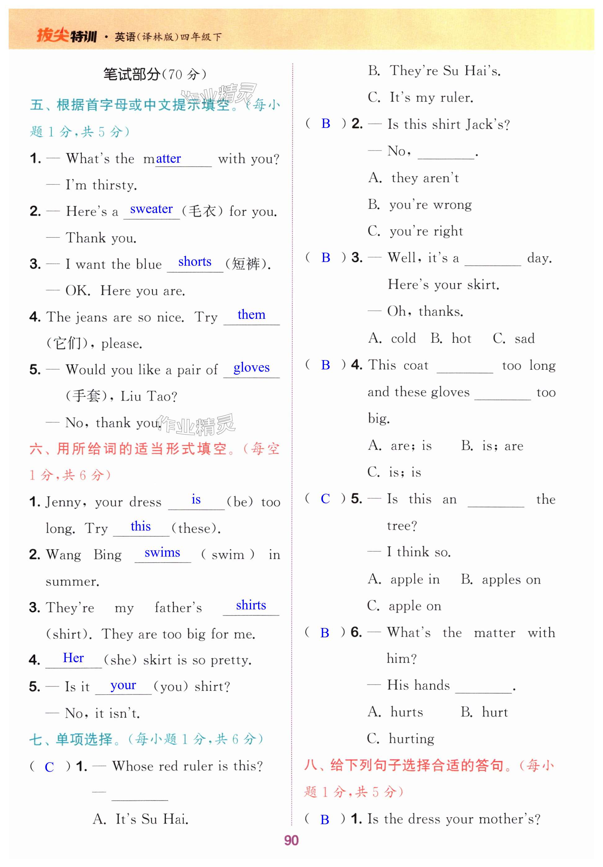 注:目前有些书本章节名称可能整理的还不是很完善,但都是按照顺序排列的,请同学们按照顺序仔细查找。练习册 2024年拔尖特训四年级英语下册译林版 答案主要是用来给同学们做完题方便对答案用的,请勿直接抄袭。