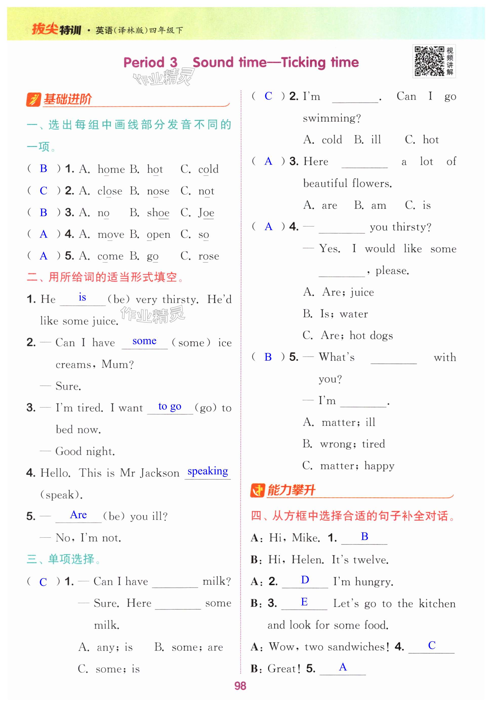 注:目前有些书本章节名称可能整理的还不是很完善,但都是按照顺序排列的,请同学们按照顺序仔细查找。练习册 2024年拔尖特训四年级英语下册译林版 答案主要是用来给同学们做完题方便对答案用的,请勿直接抄袭。