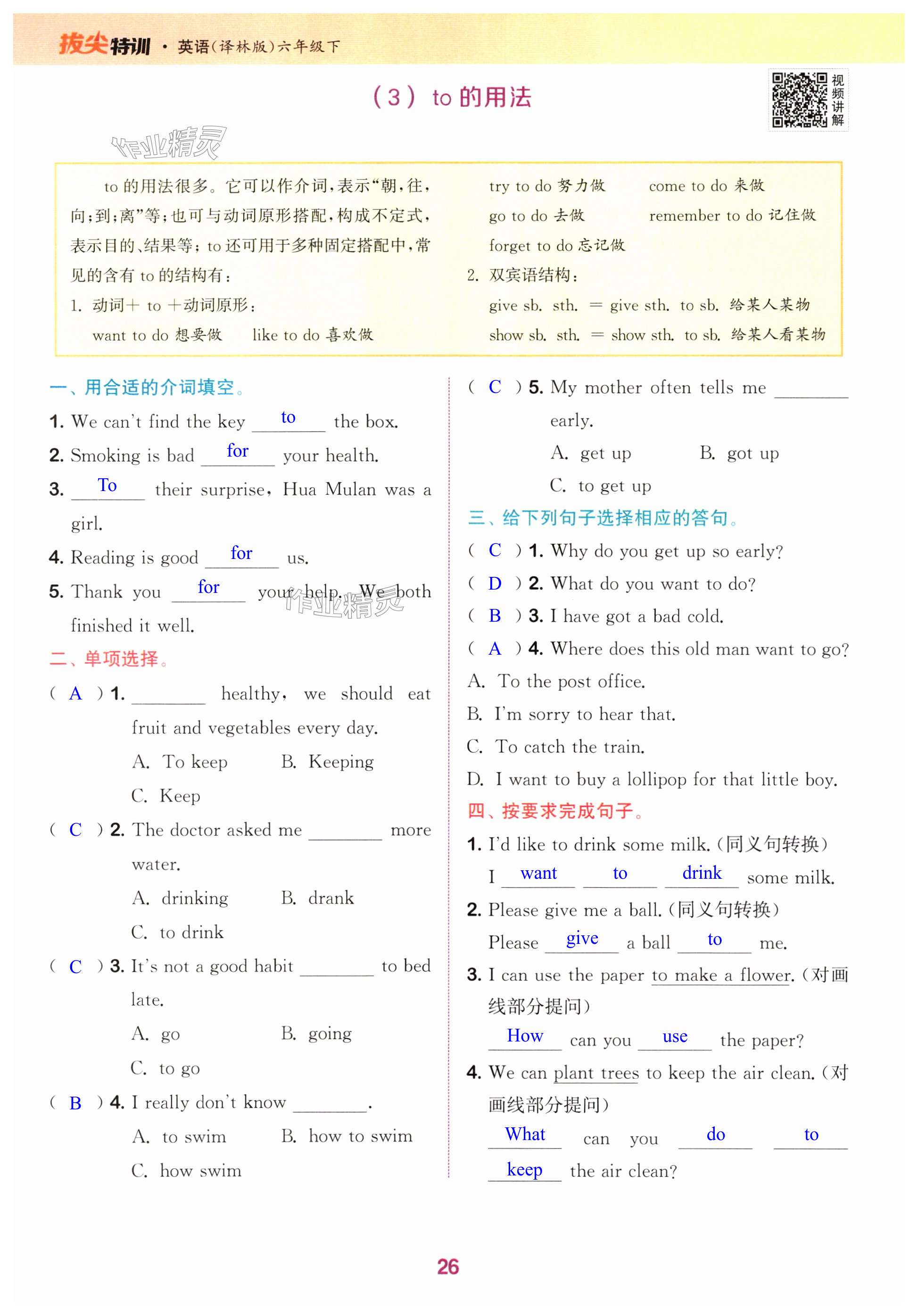 注:目前有些书本章节名称可能整理的还不是很完善,但都是按照顺序排列的,请同学们按照顺序仔细查找。练习册 2024年拔尖特训六年级英语下册译林版 答案主要是用来给同学们做完题方便对答案用的,请勿直接抄袭。