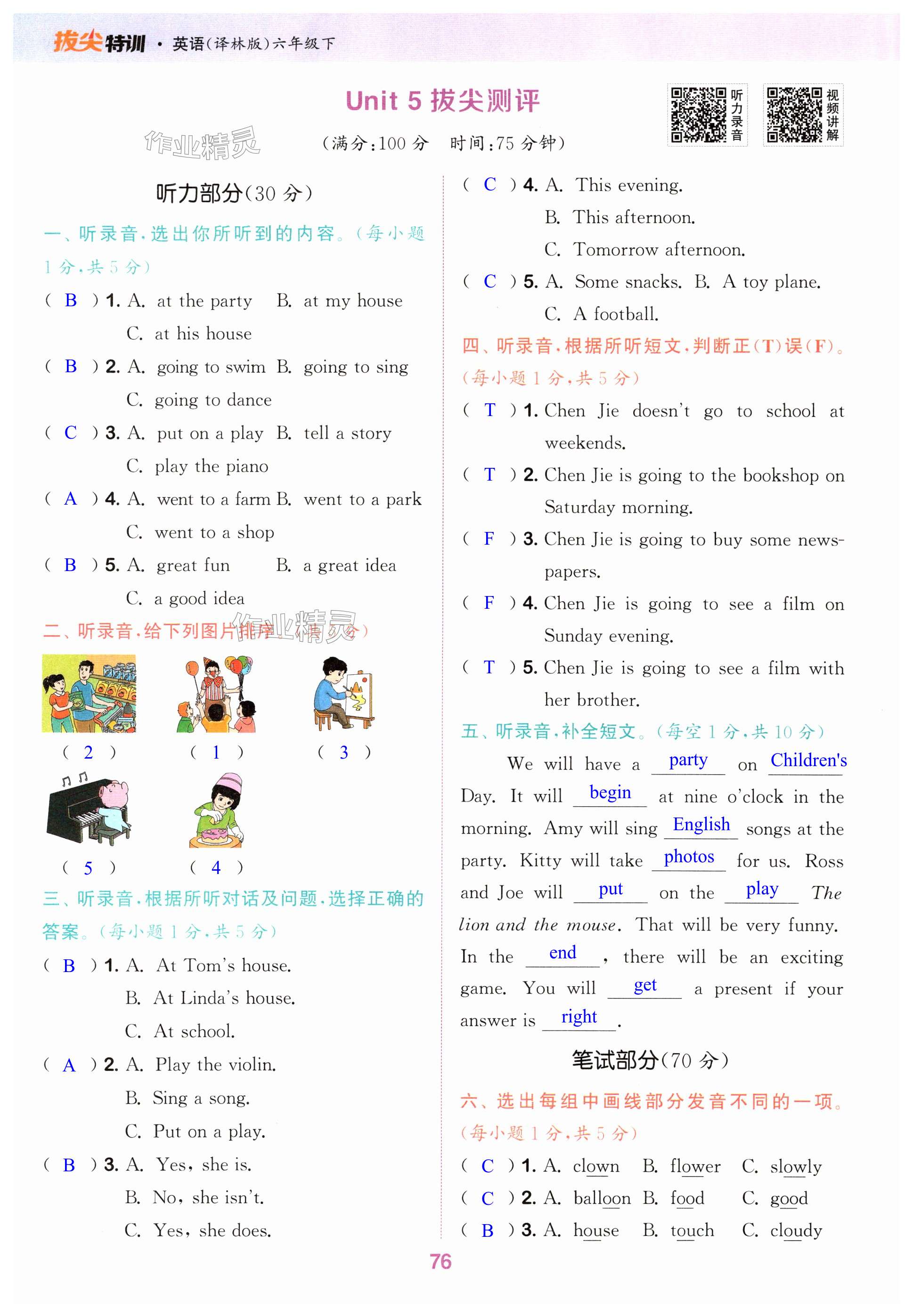 注:目前有些书本章节名称可能整理的还不是很完善,但都是按照顺序排列的,请同学们按照顺序仔细查找。练习册 2024年拔尖特训六年级英语下册译林版 答案主要是用来给同学们做完题方便对答案用的,请勿直接抄袭。