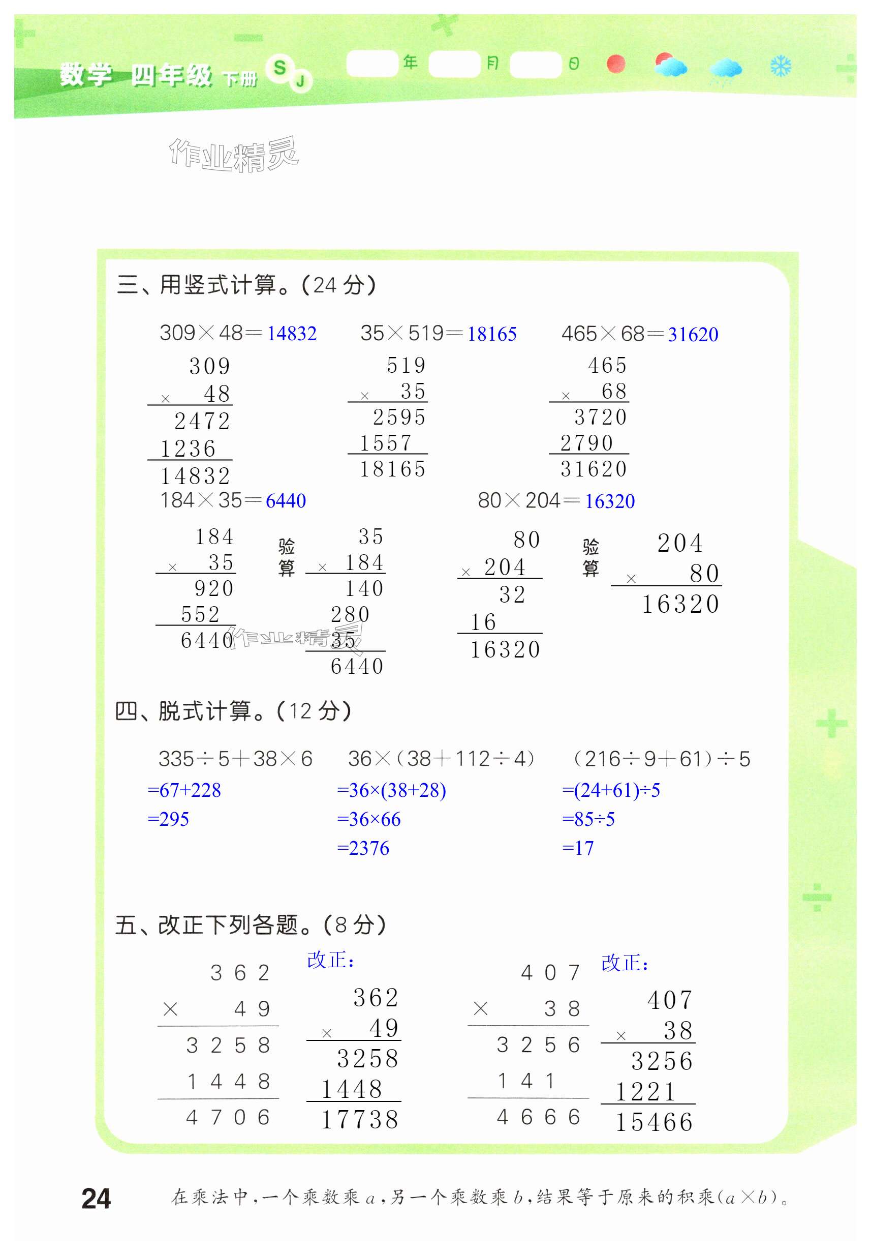 注:目前有些书本章节名称可能整理的还不是很完善,但都是按照顺序排列的,请同学们按照顺序仔细查找。练习册 2024年口算大通关四年级数学下册苏教版 答案主要是用来给同学们做完题方便对答案用的,请勿直接抄袭。