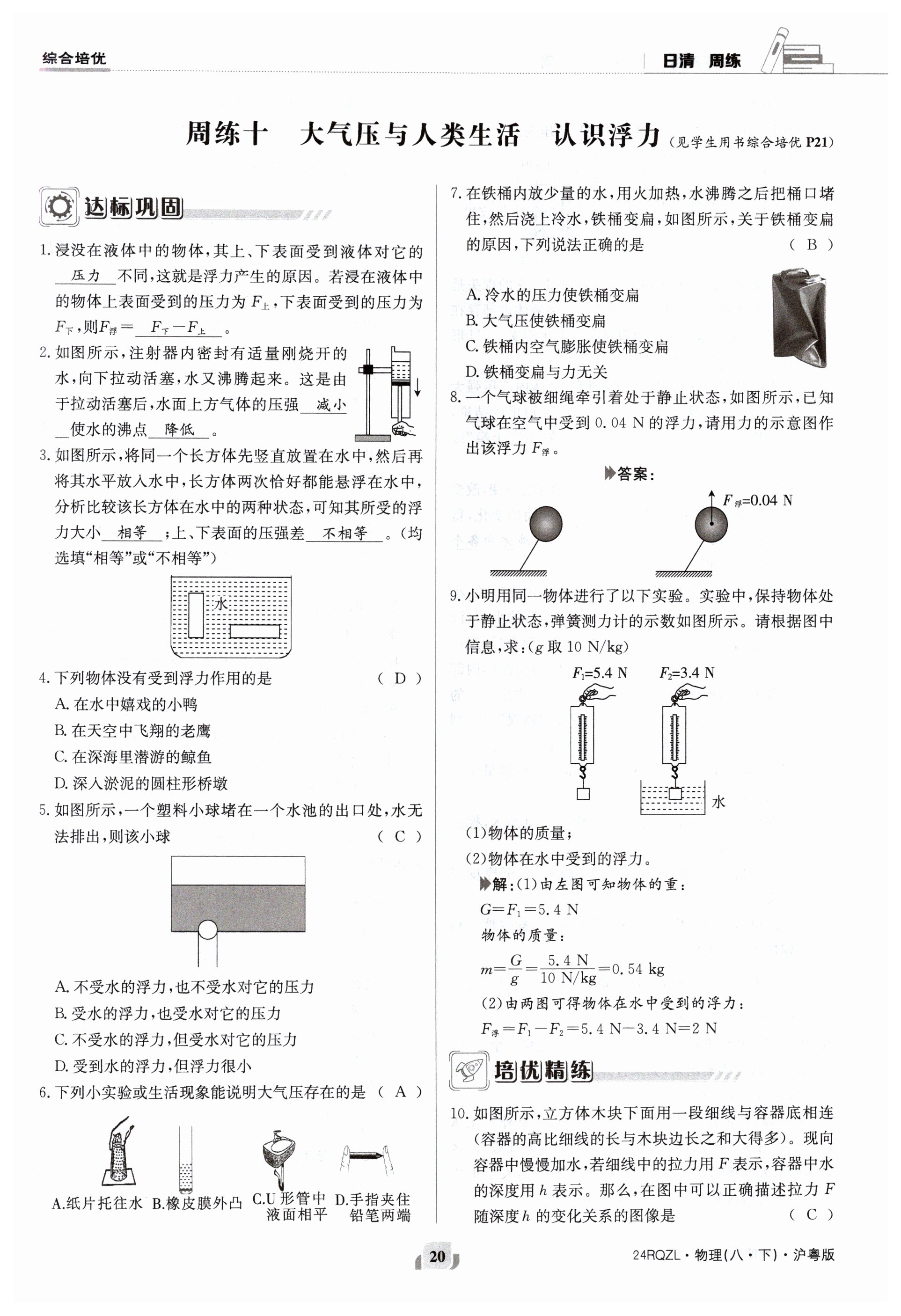 注:目前有些书本章节名称可能整理的还不是很完善,但都是按照顺序排列的,请同学们按照顺序仔细查找。练习册 2024年日清周练八年级物理下册沪粤版 答案主要是用来给同学们做完题方便对答案用的,请勿直接抄袭。