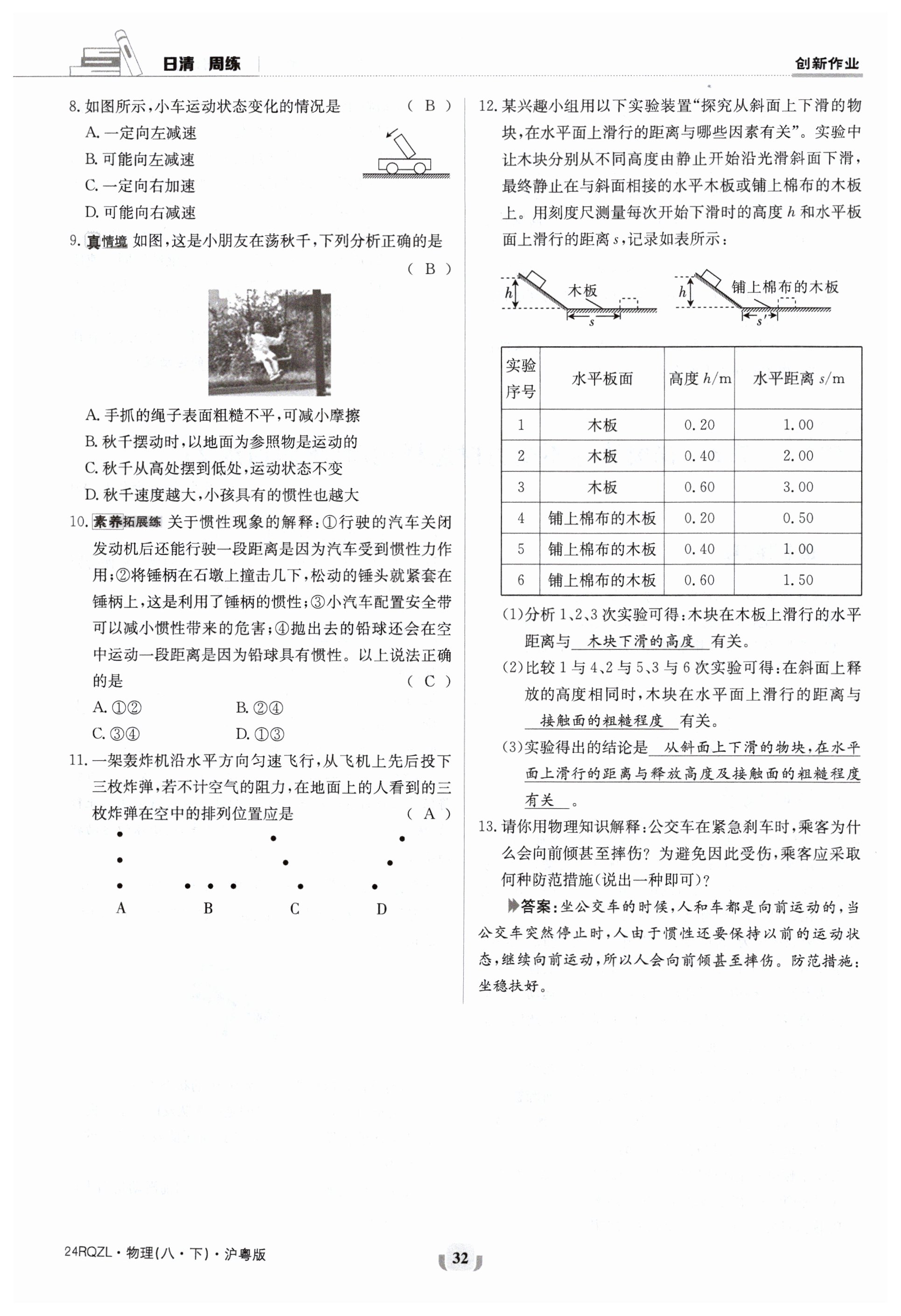 注:目前有些书本章节名称可能整理的还不是很完善,但都是按照顺序排列的,请同学们按照顺序仔细查找。练习册 2024年日清周练八年级物理下册沪粤版 答案主要是用来给同学们做完题方便对答案用的,请勿直接抄袭。