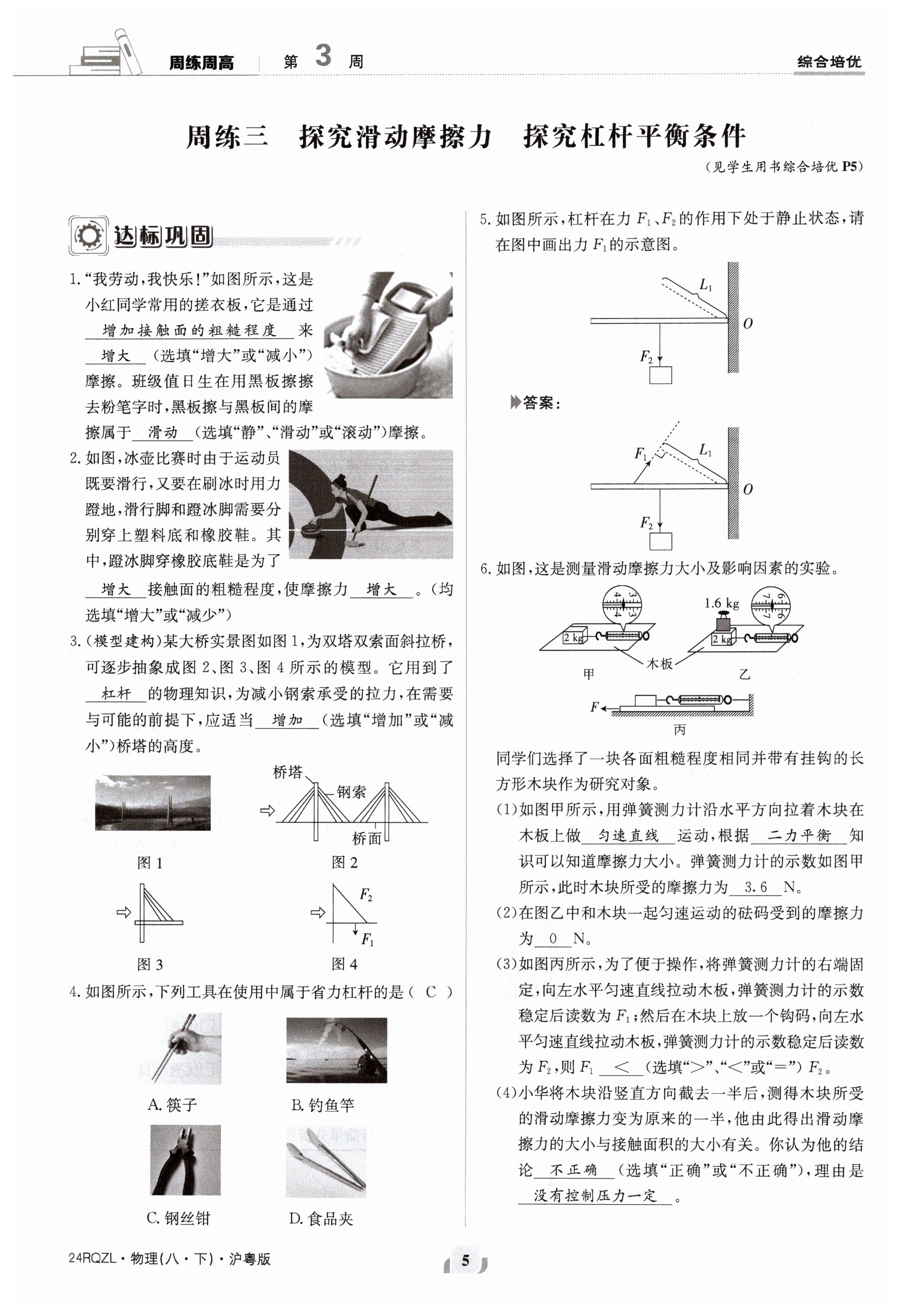 注:目前有些书本章节名称可能整理的还不是很完善,但都是按照顺序排列的,请同学们按照顺序仔细查找。练习册 2024年日清周练八年级物理下册沪粤版 答案主要是用来给同学们做完题方便对答案用的,请勿直接抄袭。