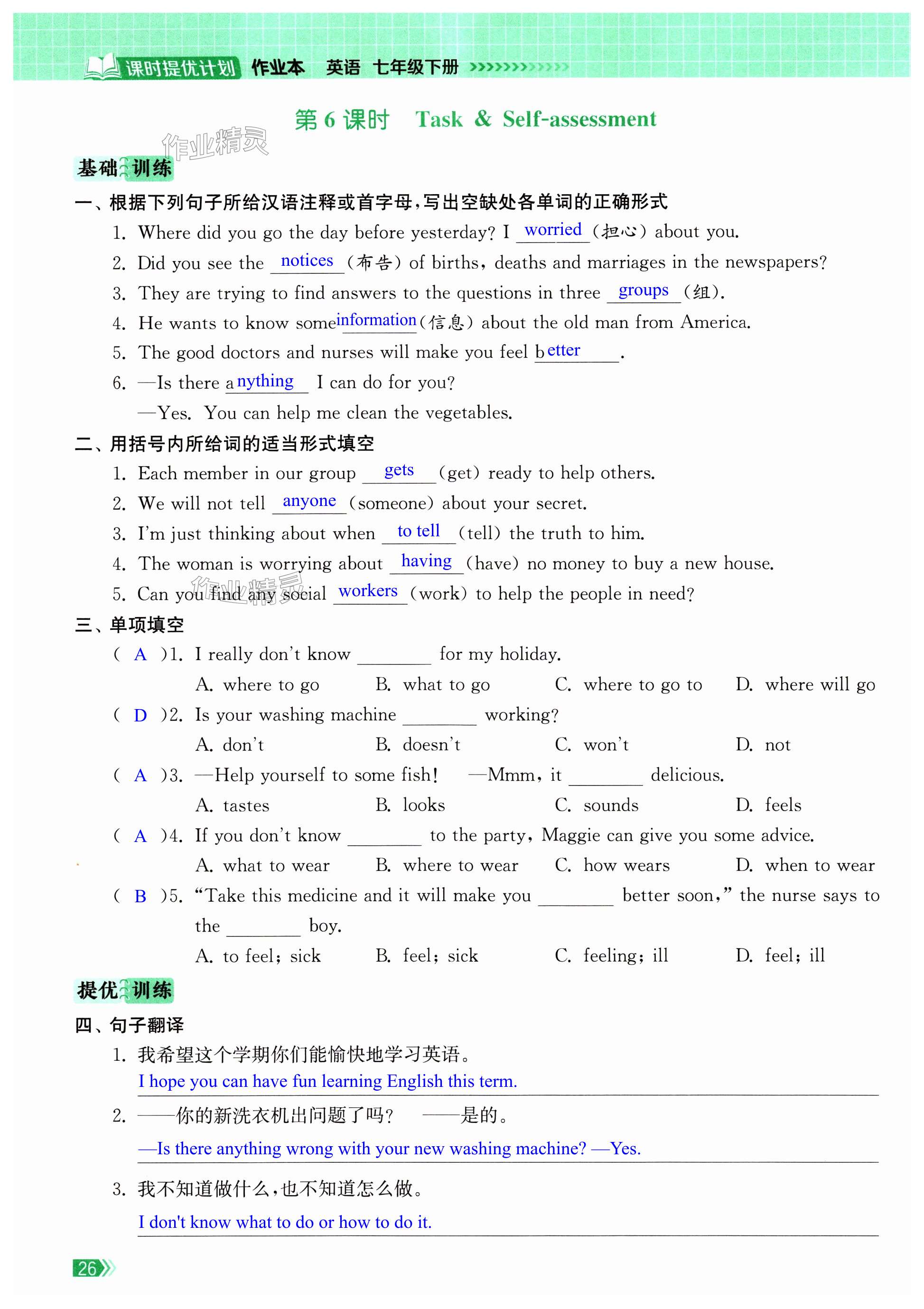 注:目前有些书本章节名称可能整理的还不是很完善,但都是按照顺序排列的,请同学们按照顺序仔细查找。练习册 2024年课时提优计划作业本七年级英语下册译林版苏州专版 答案主要是用来给同学们做完题方便对答案用的,请勿直接抄袭。