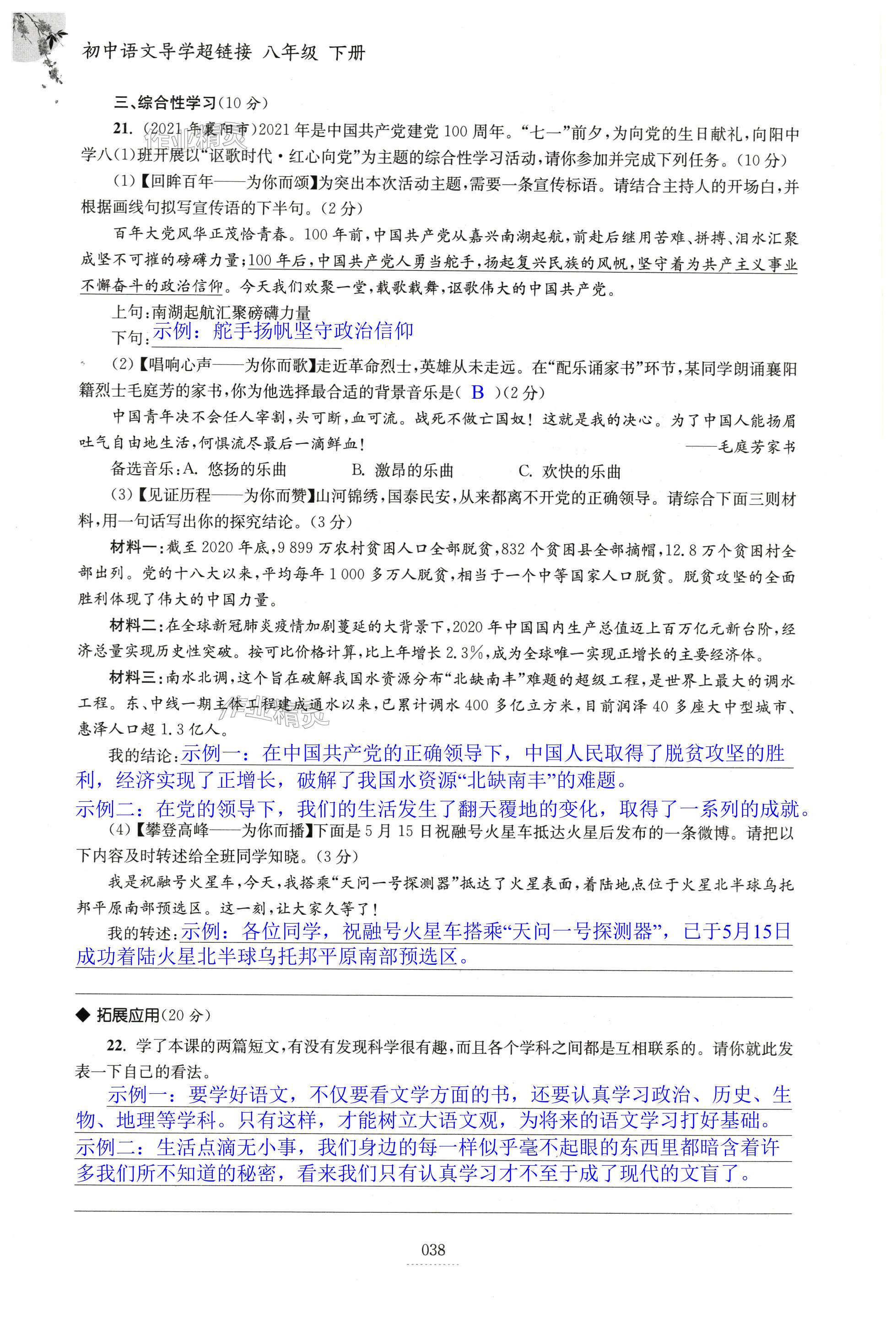 注:目前有些书本章节名称可能整理的还不是很完善,但都是按照顺序排列的,请同学们按照顺序仔细查找。练习册 2024年导学超链接八年级语文下册人教版 答案主要是用来给同学们做完题方便对答案用的,请勿直接抄袭。
