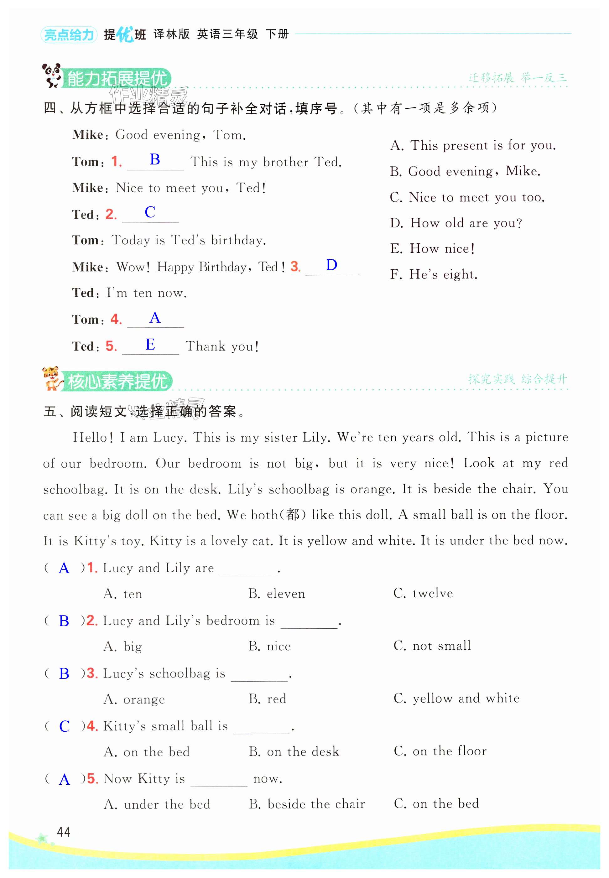 注:目前有些书本章节名称可能整理的还不是很完善,但都是按照顺序排列的,请同学们按照顺序仔细查找。练习册 2024年亮点给力提优班三年级英语下册译林版 答案主要是用来给同学们做完题方便对答案用的,请勿直接抄袭。