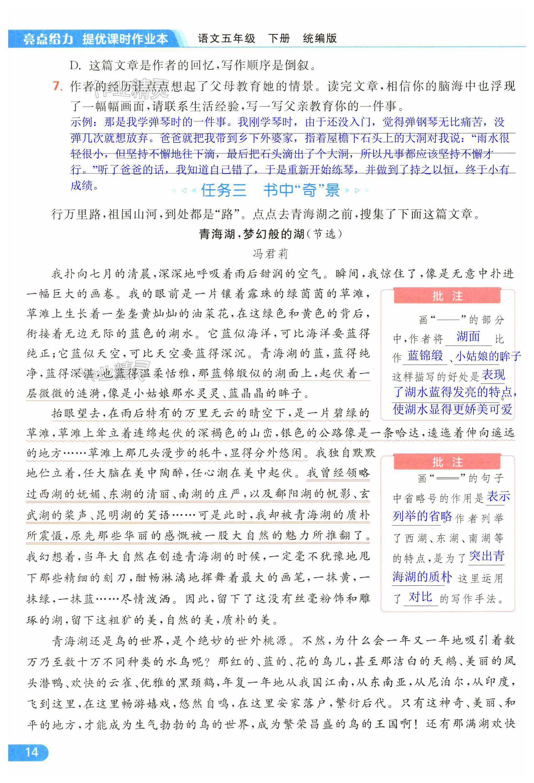 注:目前有些书本章节名称可能整理的还不是很完善,但都是按照顺序排列的,请同学们按照顺序仔细查找。练习册 2024年亮点给力提优课时作业本五年级语文下册统编版 答案主要是用来给同学们做完题方便对答案用的,请勿直接抄袭。