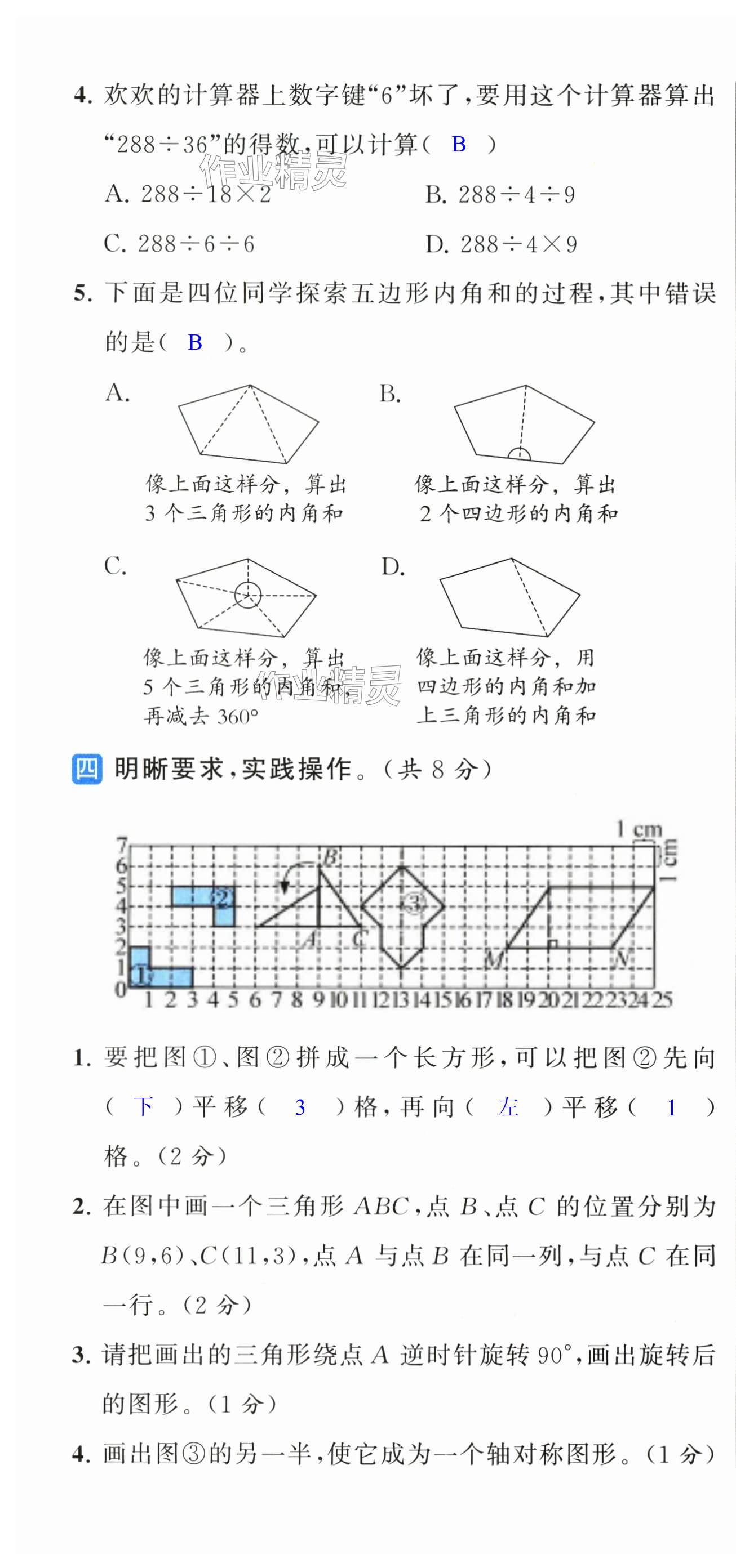 注:目前有些书本章节名称可能整理的还不是很完善,但都是按照顺序排列的,请同学们按照顺序仔细查找。练习册 2024年同步跟踪全程检测四年级数学下册苏教版 答案主要是用来给同学们做完题方便对答案用的,请勿直接抄袭。