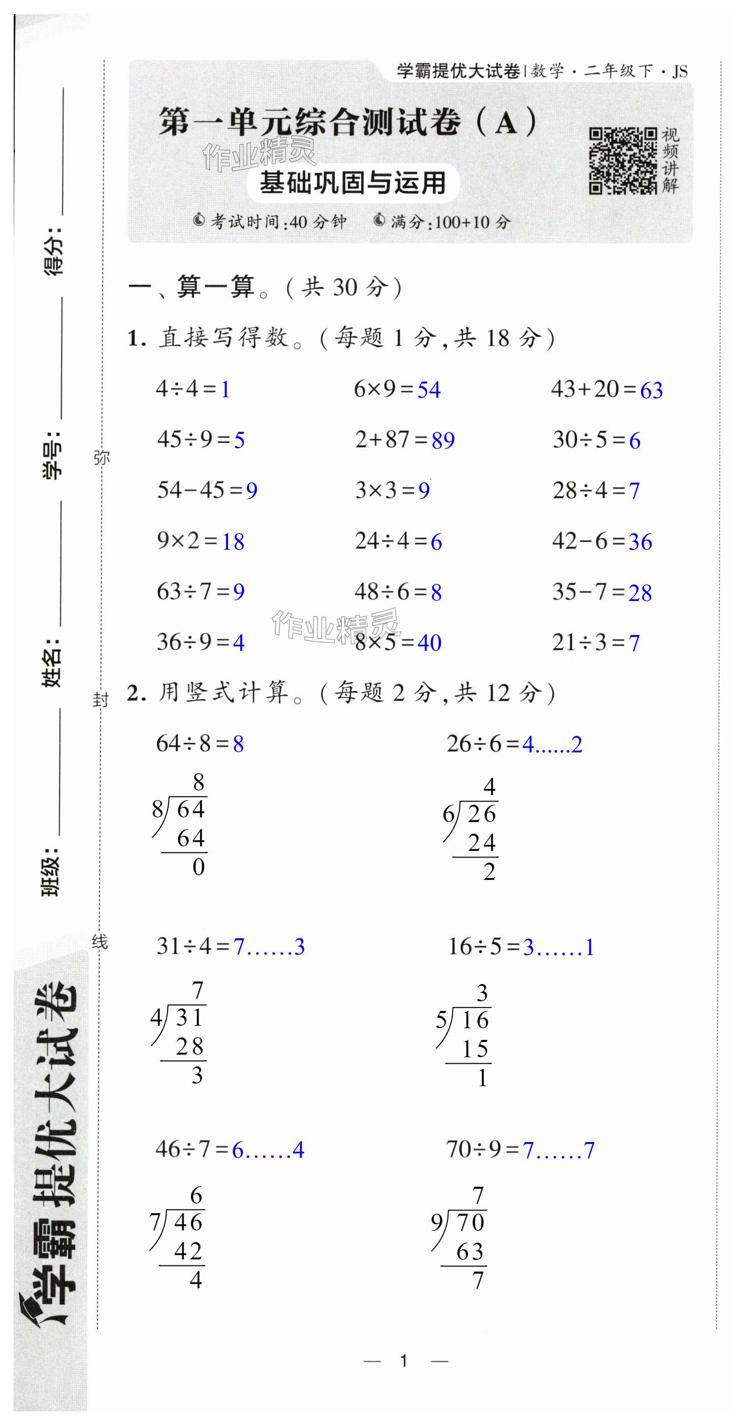 注:目前有些书本章节名称可能整理的还不是很完善,但都是按照顺序排列的,请同学们按照顺序仔细查找。练习册 2024年学霸提优大试卷二年级数学下册苏教版 答案主要是用来给同学们做完题方便对答案用的,请勿直接抄袭。