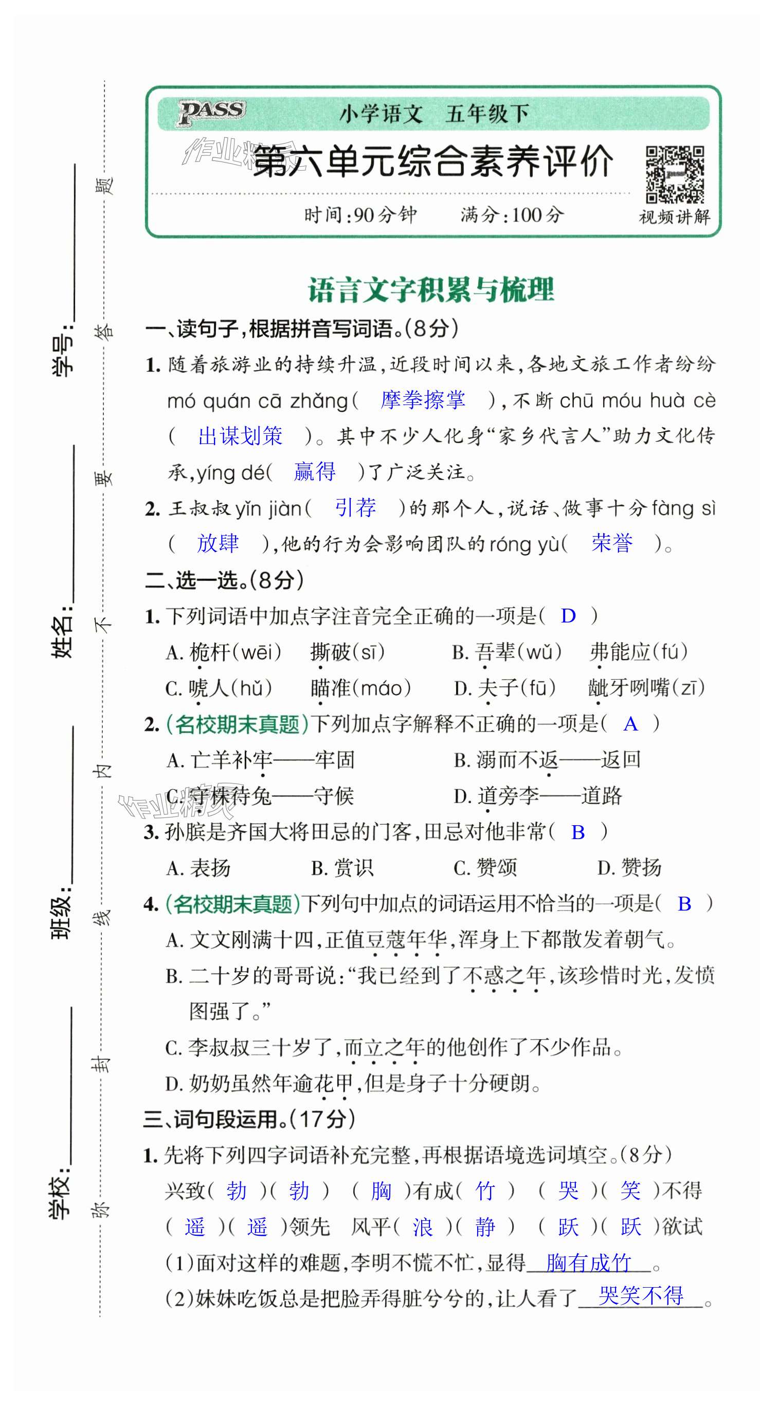 注:目前有些书本章节名称可能整理的还不是很完善,但都是按照顺序排列的,请同学们按照顺序仔细查找。练习册 2024年小学学霸冲A卷五年级语文下册人教版 答案主要是用来给同学们做完题方便对答案用的,请勿直接抄袭。