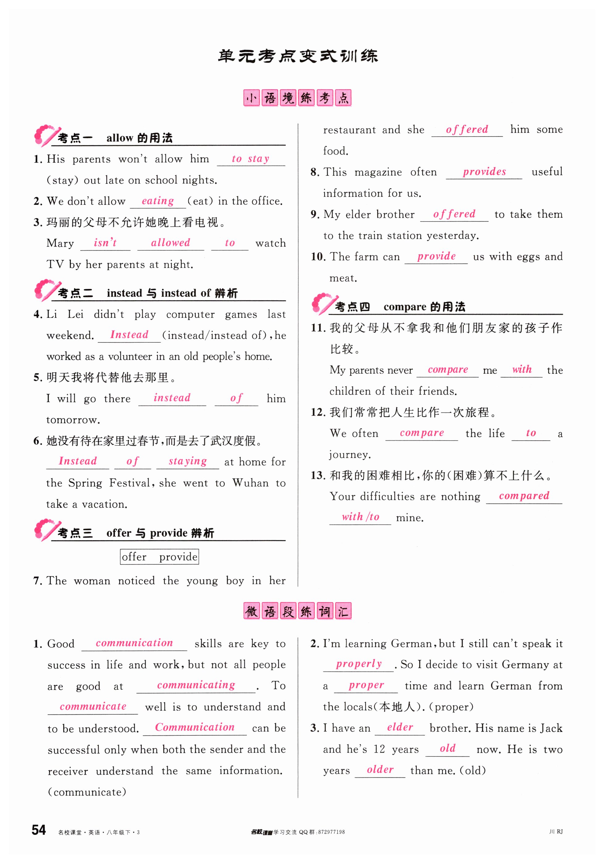 注:目前有些书本章节名称可能整理的还不是很完善,但都是按照顺序排列的,请同学们按照顺序仔细查找。练习册 2024年名校课堂八年级英语下册人教版四川专版 答案主要是用来给同学们做完题方便对答案用的,请勿直接抄袭。