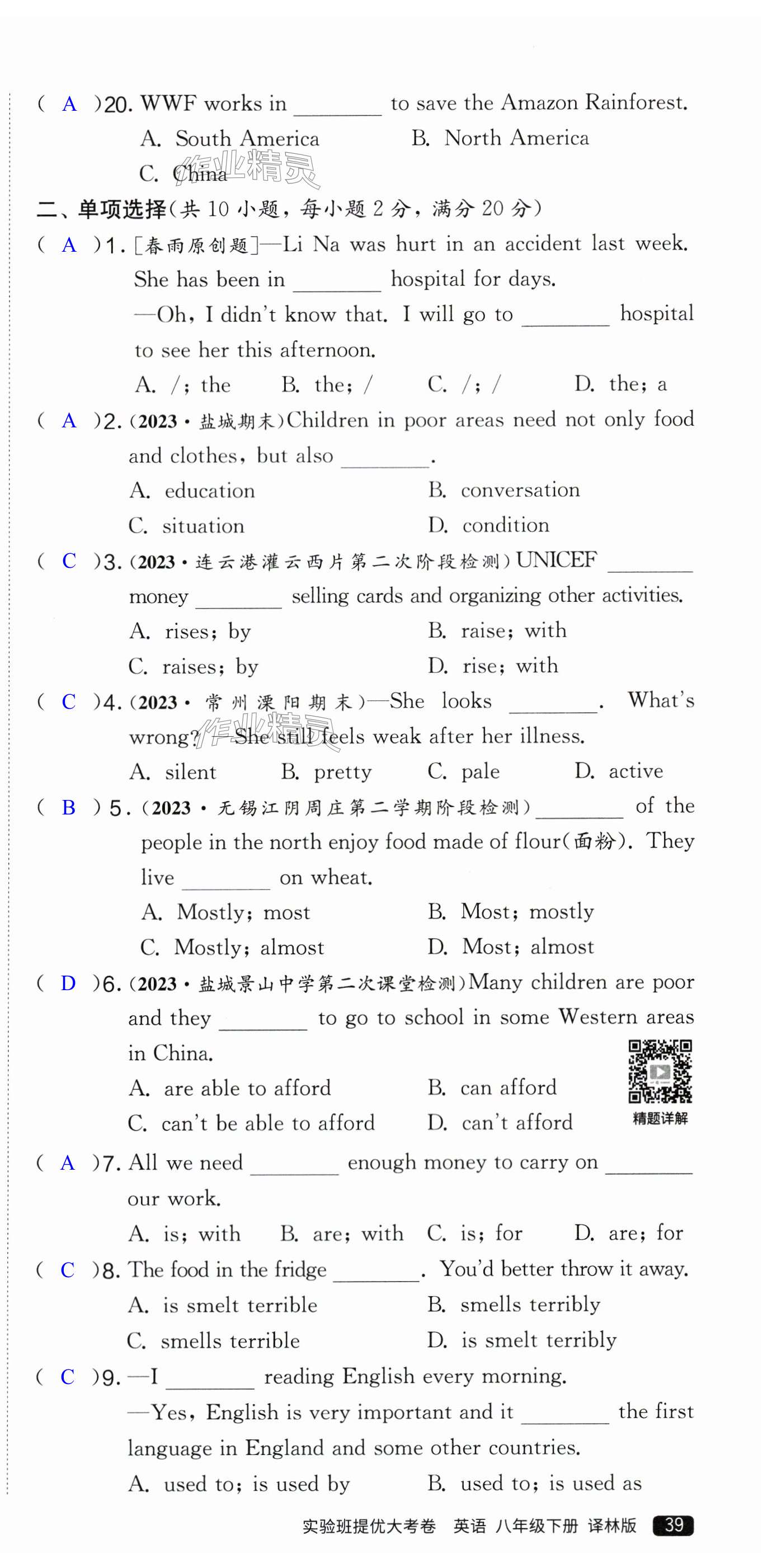 注:目前有些书本章节名称可能整理的还不是很完善,但都是按照顺序排列的,请同学们按照顺序仔细查找。练习册 2024年实验班提优大考卷八年级英语下册译林版 答案主要是用来给同学们做完题方便对答案用的,请勿直接抄袭。