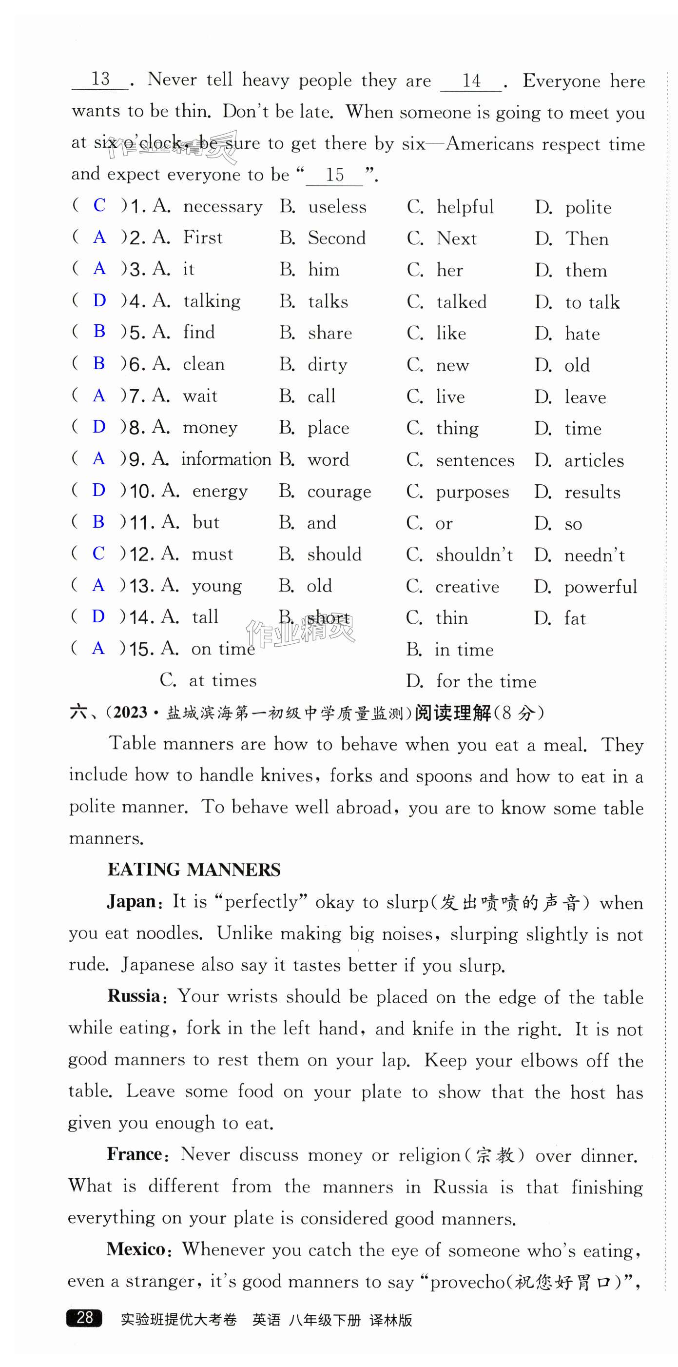注:目前有些书本章节名称可能整理的还不是很完善,但都是按照顺序排列的,请同学们按照顺序仔细查找。练习册 2024年实验班提优大考卷八年级英语下册译林版 答案主要是用来给同学们做完题方便对答案用的,请勿直接抄袭。