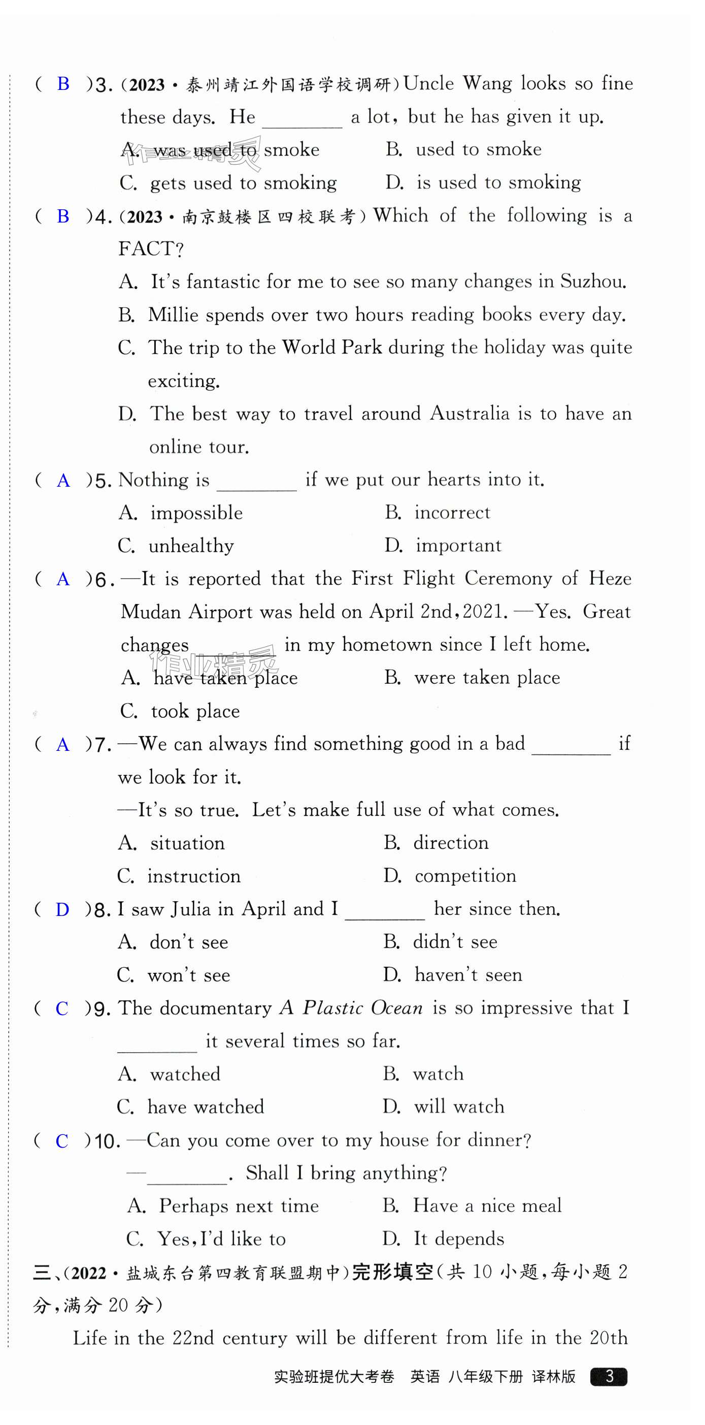 注:目前有些书本章节名称可能整理的还不是很完善,但都是按照顺序排列的,请同学们按照顺序仔细查找。练习册 2024年实验班提优大考卷八年级英语下册译林版 答案主要是用来给同学们做完题方便对答案用的,请勿直接抄袭。