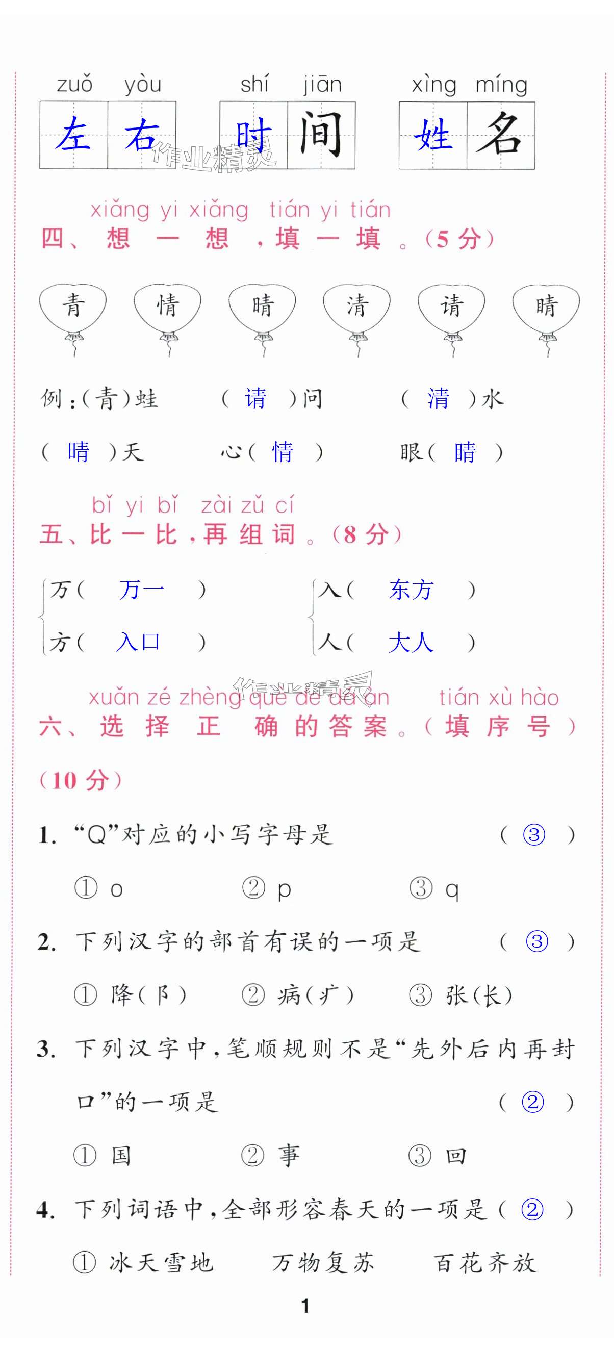 注:目前有些书本章节名称可能整理的还不是很完善,但都是按照顺序排列的,请同学们按照顺序仔细查找。练习册 2024年通城学典课时作业本一年级语文下册人教版江苏专版 答案主要是用来给同学们做完题方便对答案用的,请勿直接抄袭。