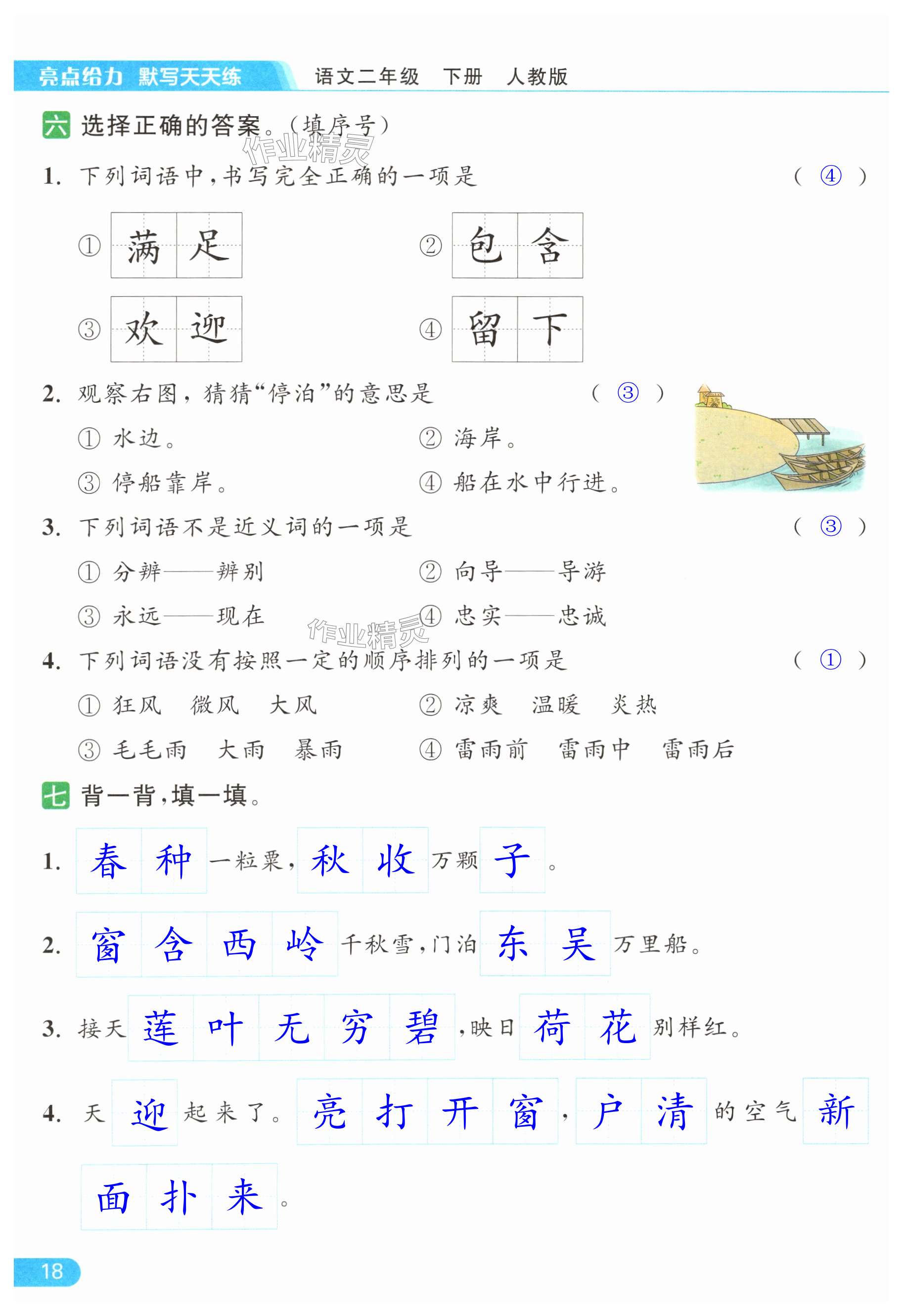 注:目前有些书本章节名称可能整理的还不是很完善,但都是按照顺序排列的,请同学们按照顺序仔细查找。练习册 2024年亮点给力默写天天练二年级语文下册人教版 答案主要是用来给同学们做完题方便对答案用的,请勿直接抄袭。