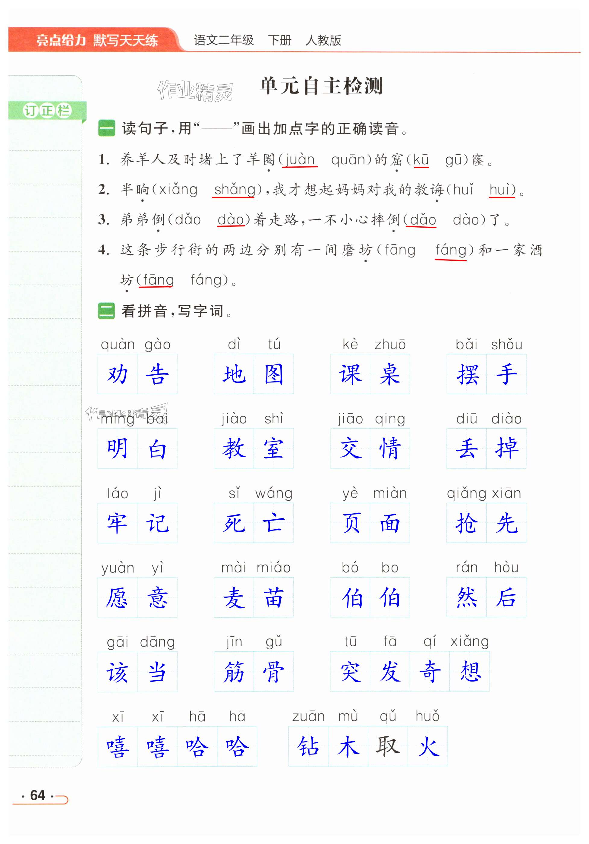 注:目前有些书本章节名称可能整理的还不是很完善,但都是按照顺序排列的,请同学们按照顺序仔细查找。练习册 2024年亮点给力默写天天练二年级语文下册人教版 答案主要是用来给同学们做完题方便对答案用的,请勿直接抄袭。