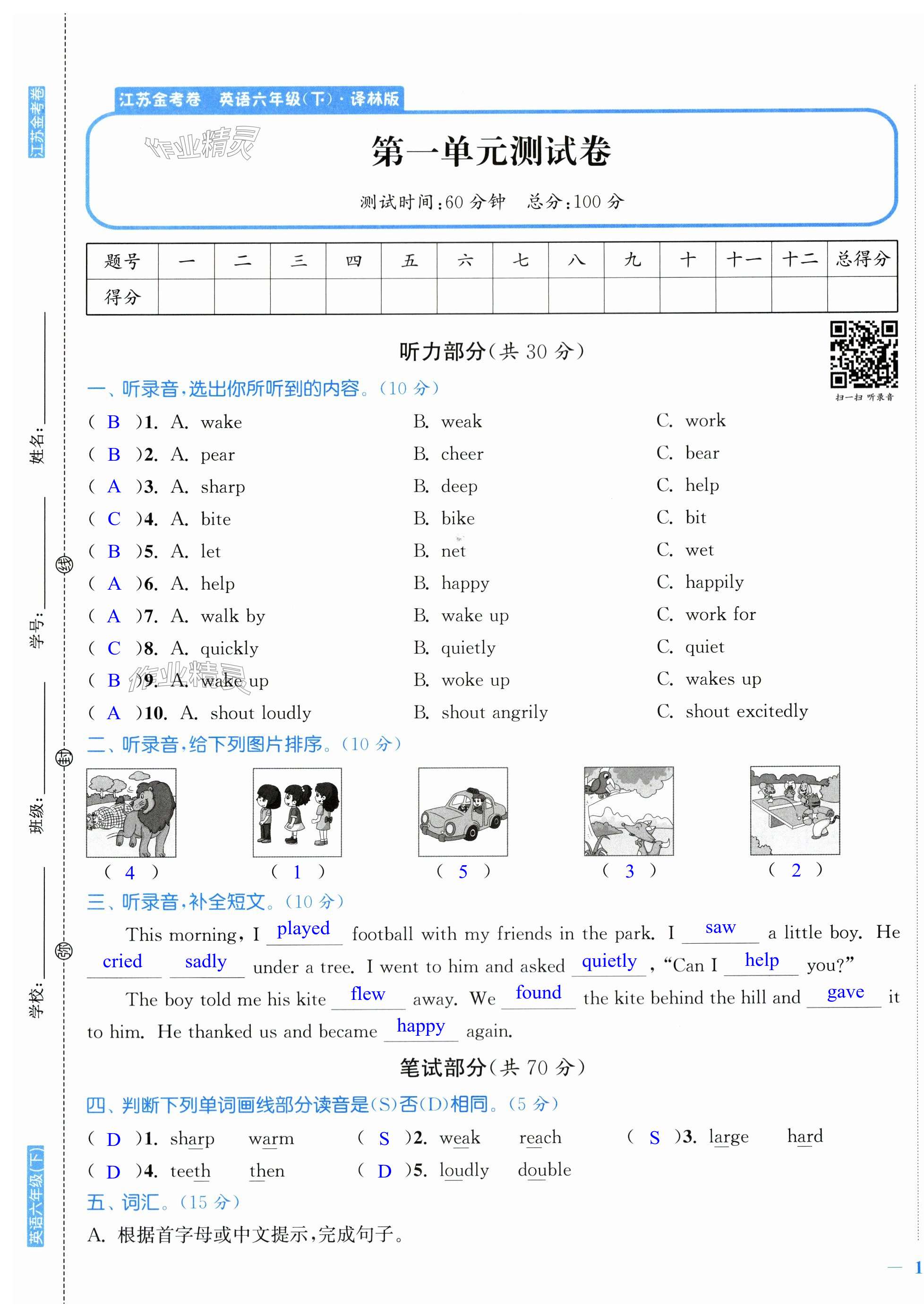 注:目前有些书本章节名称可能整理的还不是很完善,但都是按照顺序排列的,请同学们按照顺序仔细查找。练习册 2024年江苏金考卷六年级英语下册译林版 答案主要是用来给同学们做完题方便对答案用的,请勿直接抄袭。