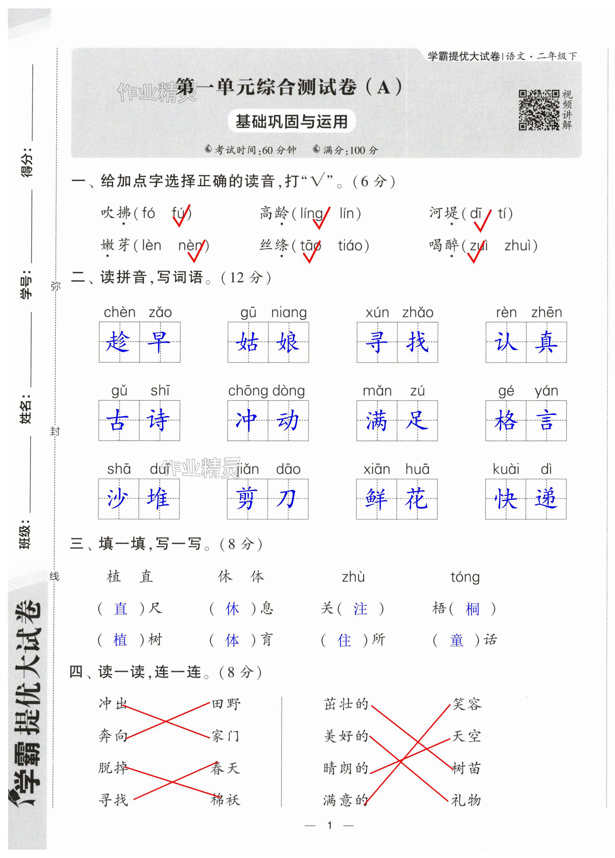 注:目前有些书本章节名称可能整理的还不是很完善,但都是按照顺序排列的,请同学们按照顺序仔细查找。练习册 2024年学霸提优大试卷二年级语文下册人教版 答案主要是用来给同学们做完题方便对答案用的,请勿直接抄袭。