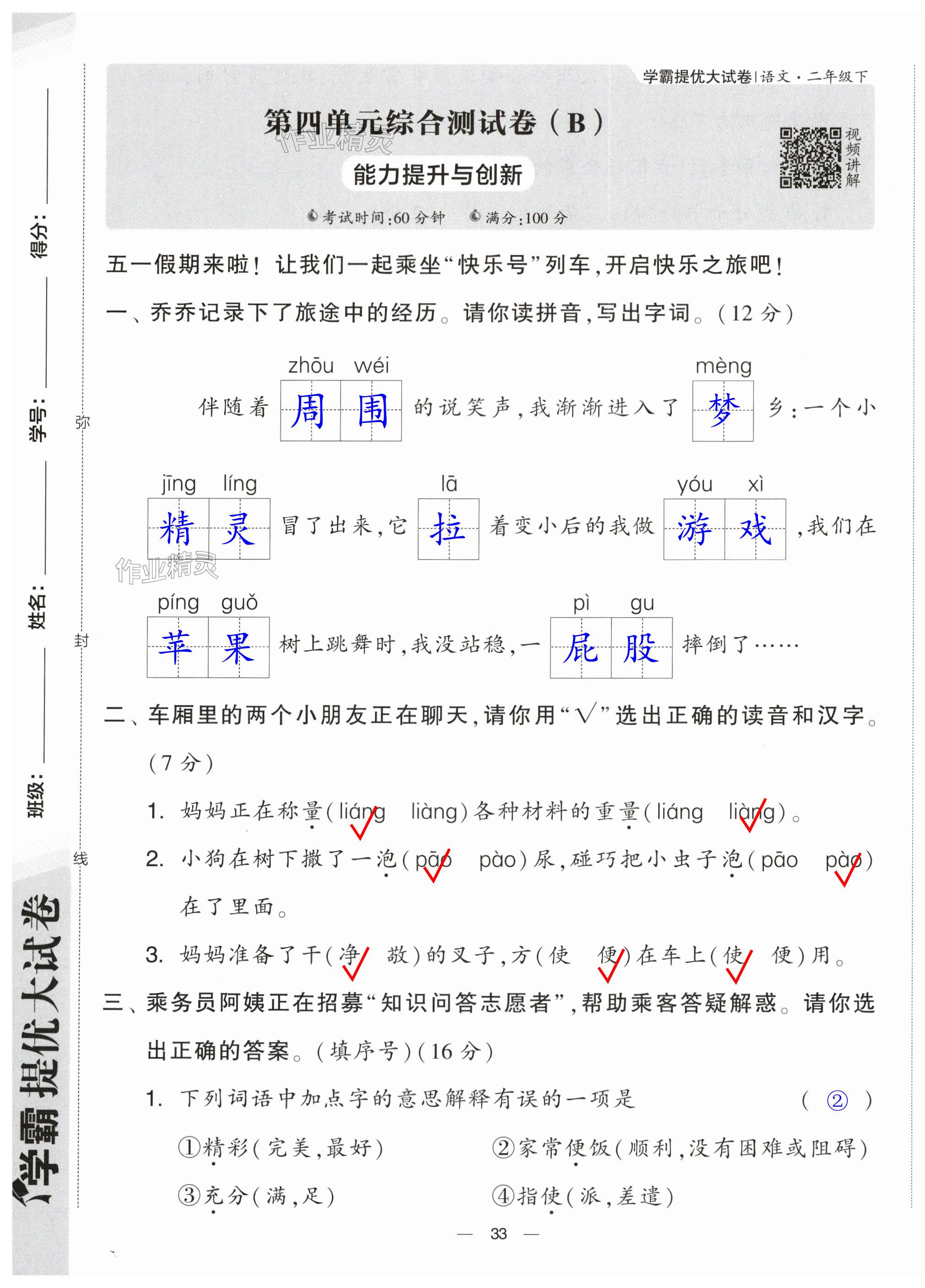 注:目前有些书本章节名称可能整理的还不是很完善,但都是按照顺序排列的,请同学们按照顺序仔细查找。练习册 2024年学霸提优大试卷二年级语文下册人教版 答案主要是用来给同学们做完题方便对答案用的,请勿直接抄袭。