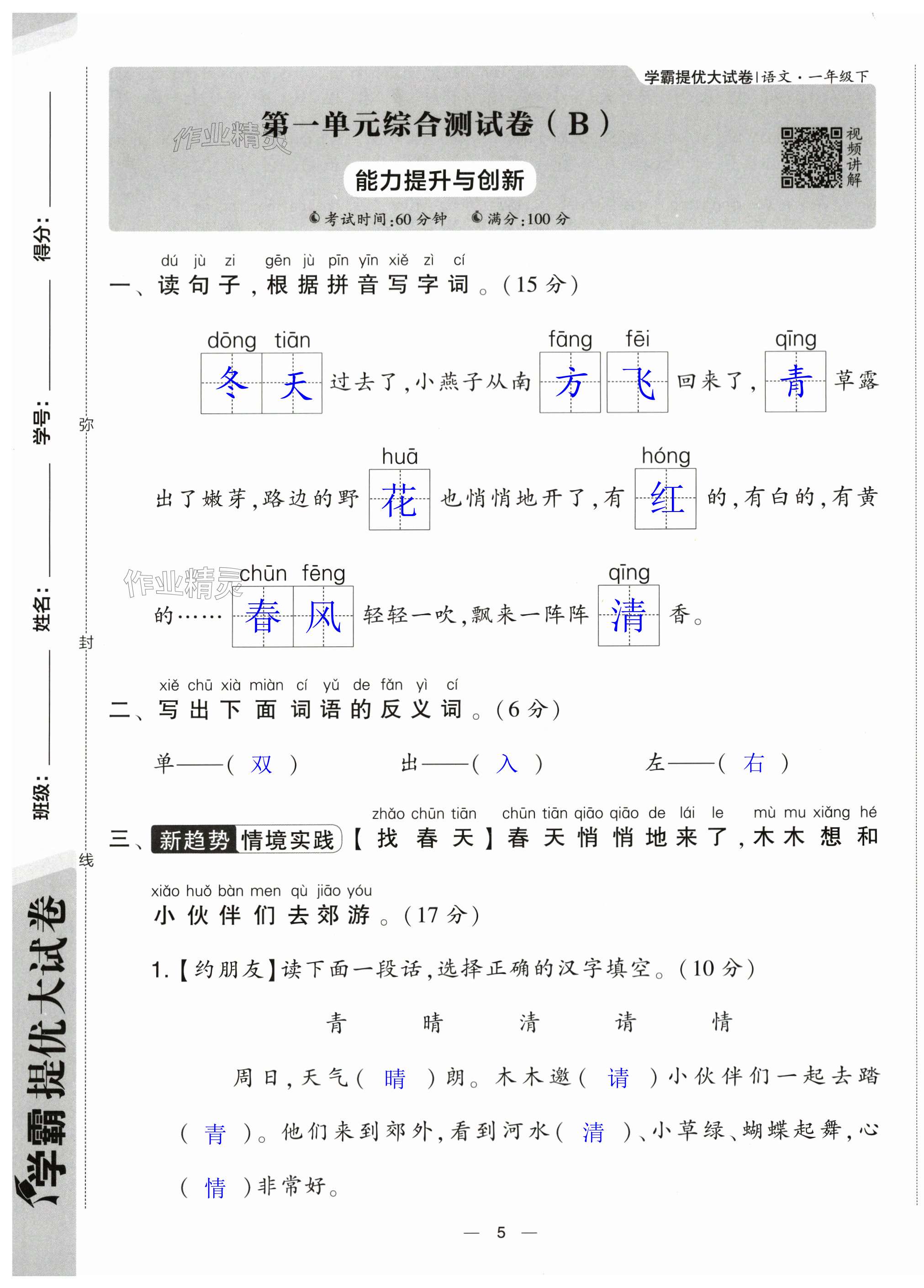注:目前有些书本章节名称可能整理的还不是很完善,但都是按照顺序排列的,请同学们按照顺序仔细查找。练习册 2024年学霸提优大试卷一年级语文下册人教版 答案主要是用来给同学们做完题方便对答案用的,请勿直接抄袭。