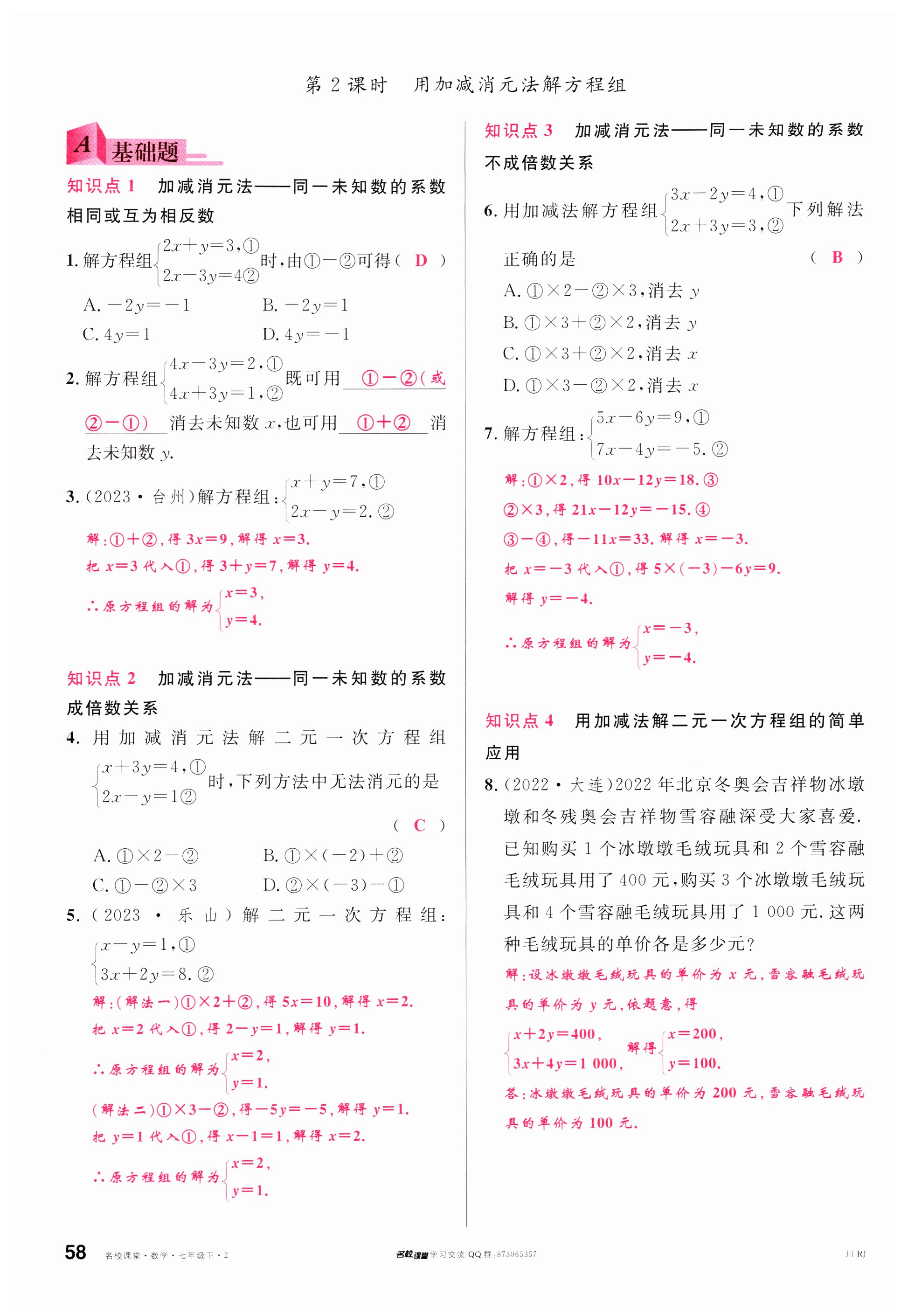 注:目前有些书本章节名称可能整理的还不是很完善,但都是按照顺序排列的,请同学们按照顺序仔细查找。练习册 2024年名校课堂七年级数学下册人教版四川专版 答案主要是用来给同学们做完题方便对答案用的,请勿直接抄袭。