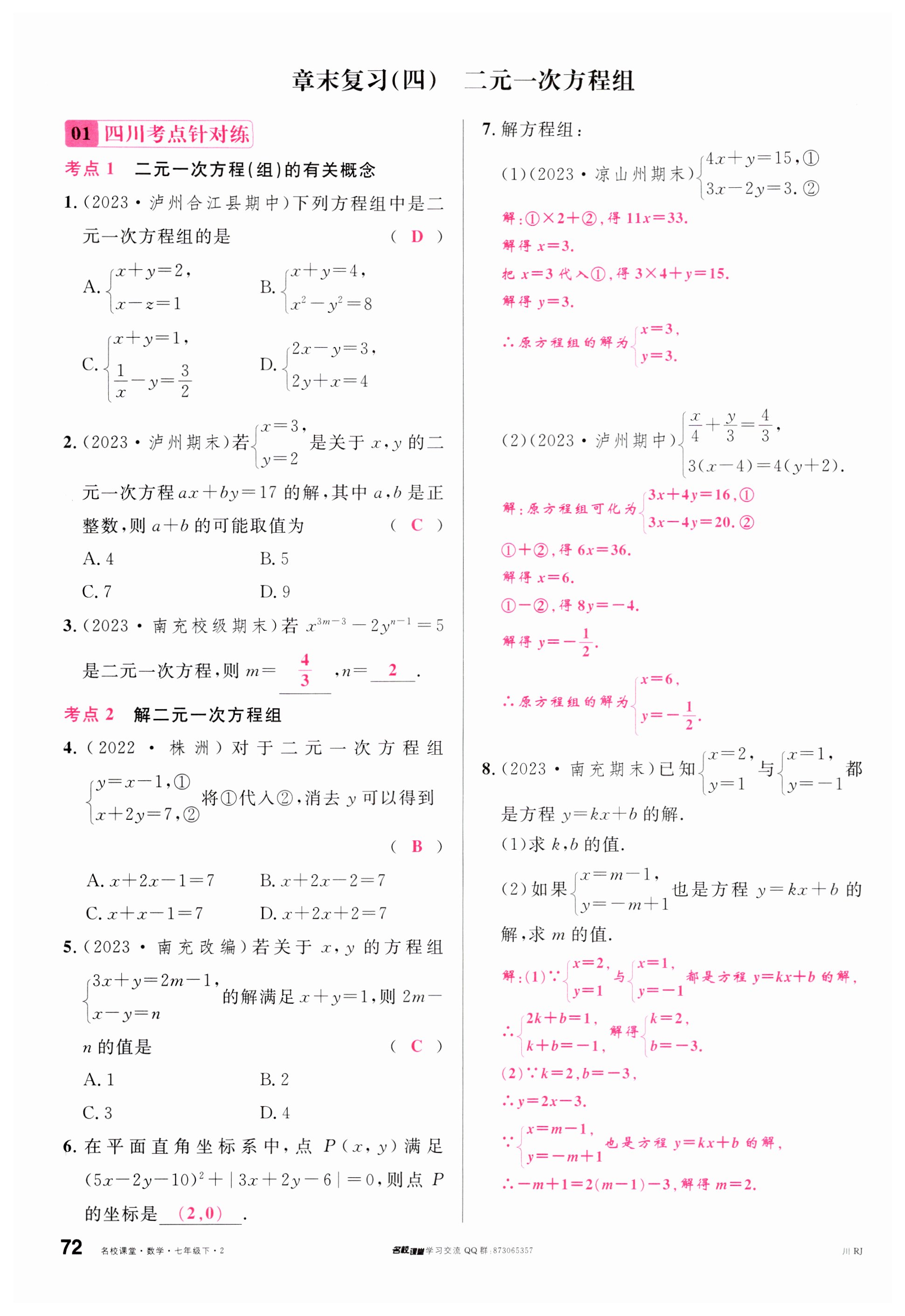 注:目前有些书本章节名称可能整理的还不是很完善,但都是按照顺序排列的,请同学们按照顺序仔细查找。练习册 2024年名校课堂七年级数学下册人教版四川专版 答案主要是用来给同学们做完题方便对答案用的,请勿直接抄袭。