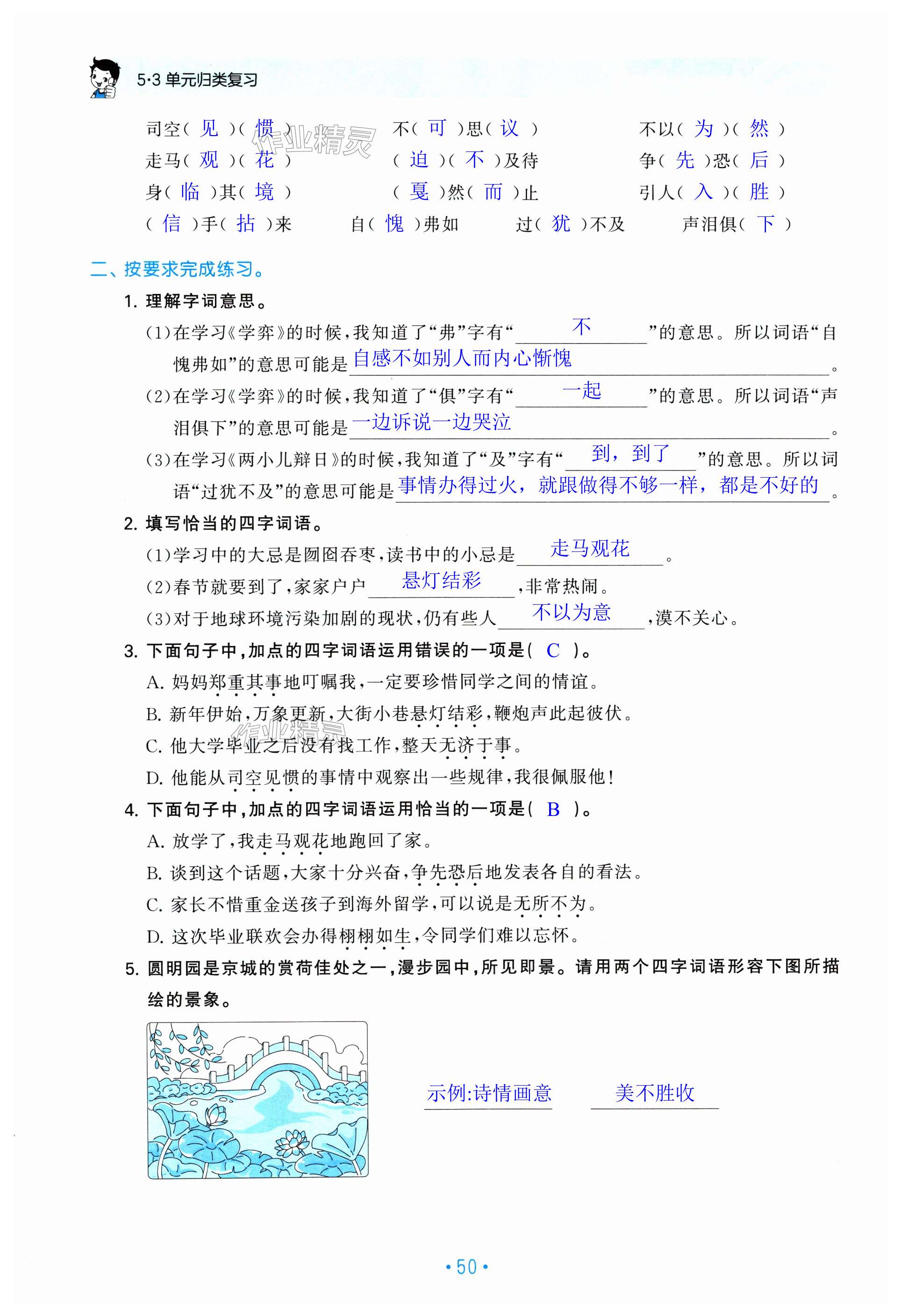 注:目前有些书本章节名称可能整理的还不是很完善,但都是按照顺序排列的,请同学们按照顺序仔细查找。练习册 2024年53单元归类复习六年级语文下册人教版 答案主要是用来给同学们做完题方便对答案用的,请勿直接抄袭。