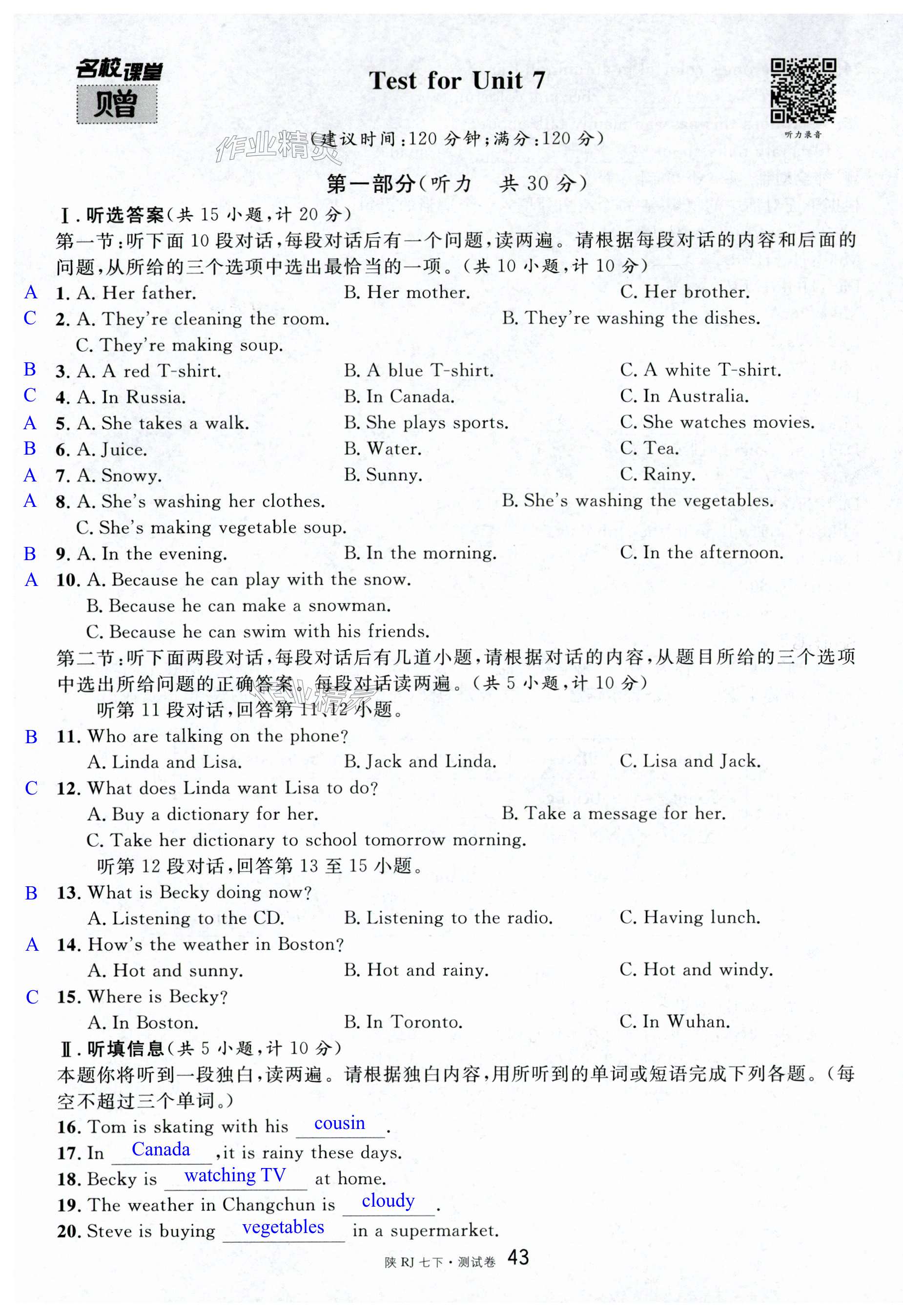 注:目前有些书本章节名称可能整理的还不是很完善,但都是按照顺序排列的,请同学们按照顺序仔细查找。练习册 2024年名校课堂七年级英语下册人教版陕西专版 答案主要是用来给同学们做完题方便对答案用的,请勿直接抄袭。