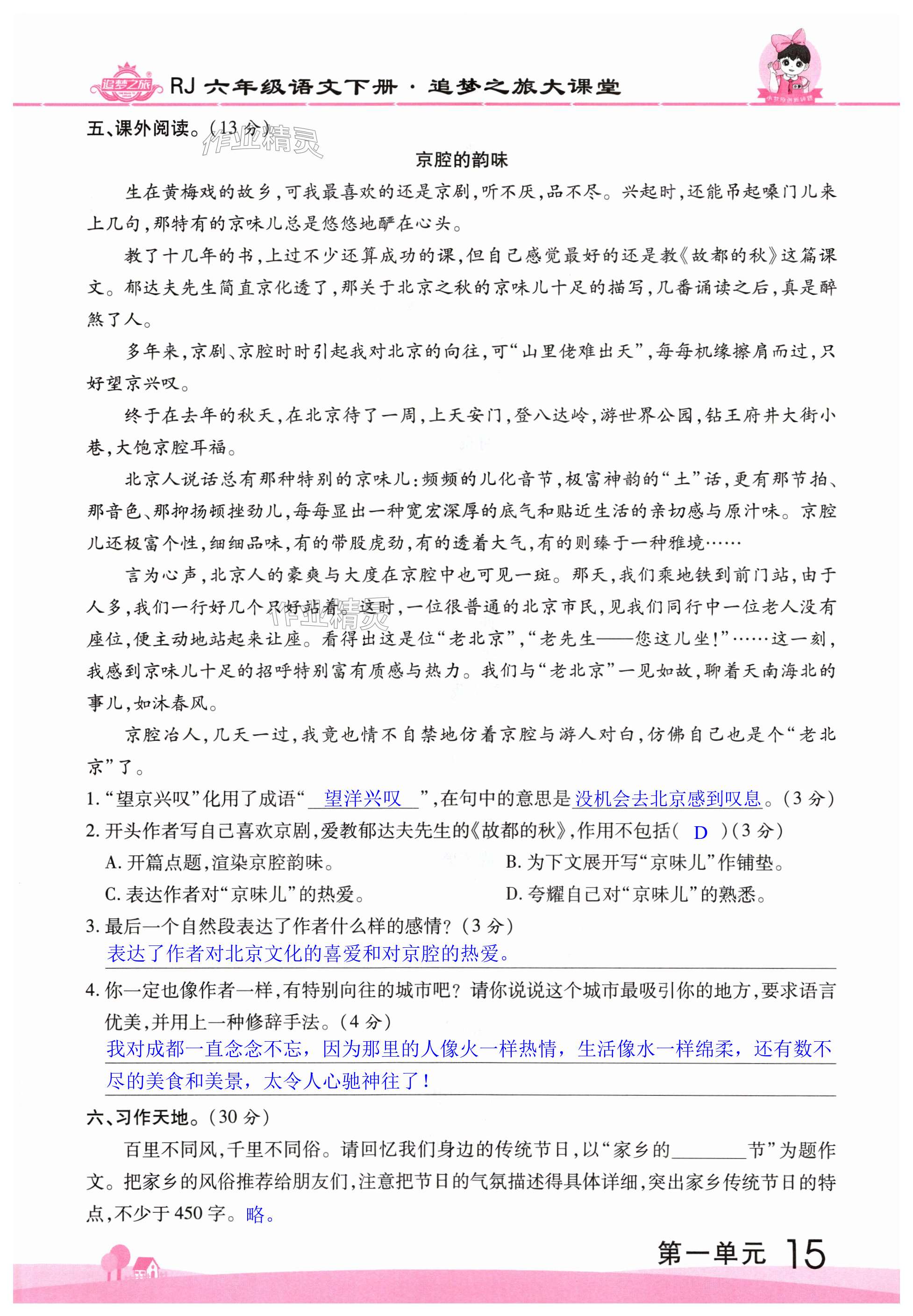 注:目前有些书本章节名称可能整理的还不是很完善,但都是按照顺序排列的,请同学们按照顺序仔细查找。练习册 2024年追梦之旅大课堂六年级语文下册人教版河南专版 答案主要是用来给同学们做完题方便对答案用的,请勿直接抄袭。