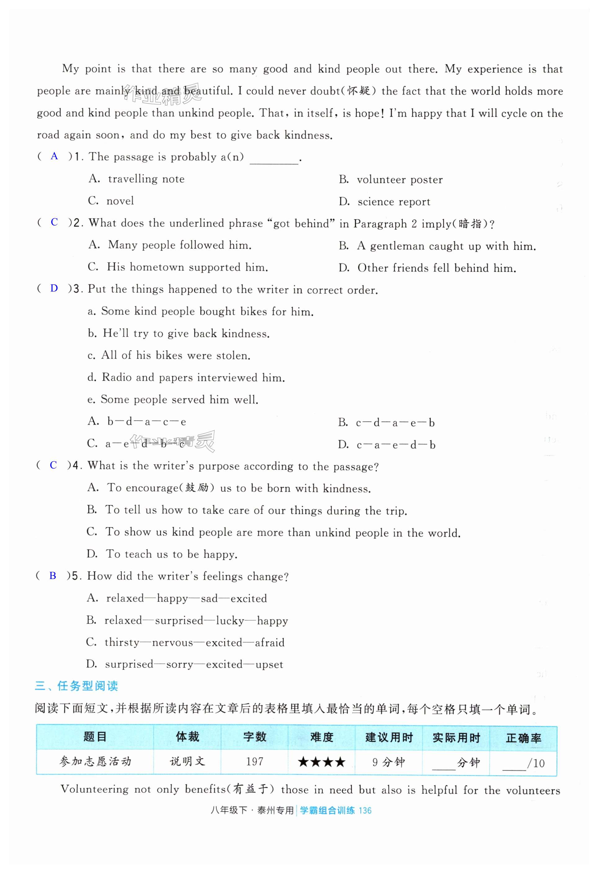 注:目前有些书本章节名称可能整理的还不是很完善,但都是按照顺序排列的,请同学们按照顺序仔细查找。练习册 2024年学霸组合训练八年级英语下册译林版泰州专版 答案主要是用来给同学们做完题方便对答案用的,请勿直接抄袭。