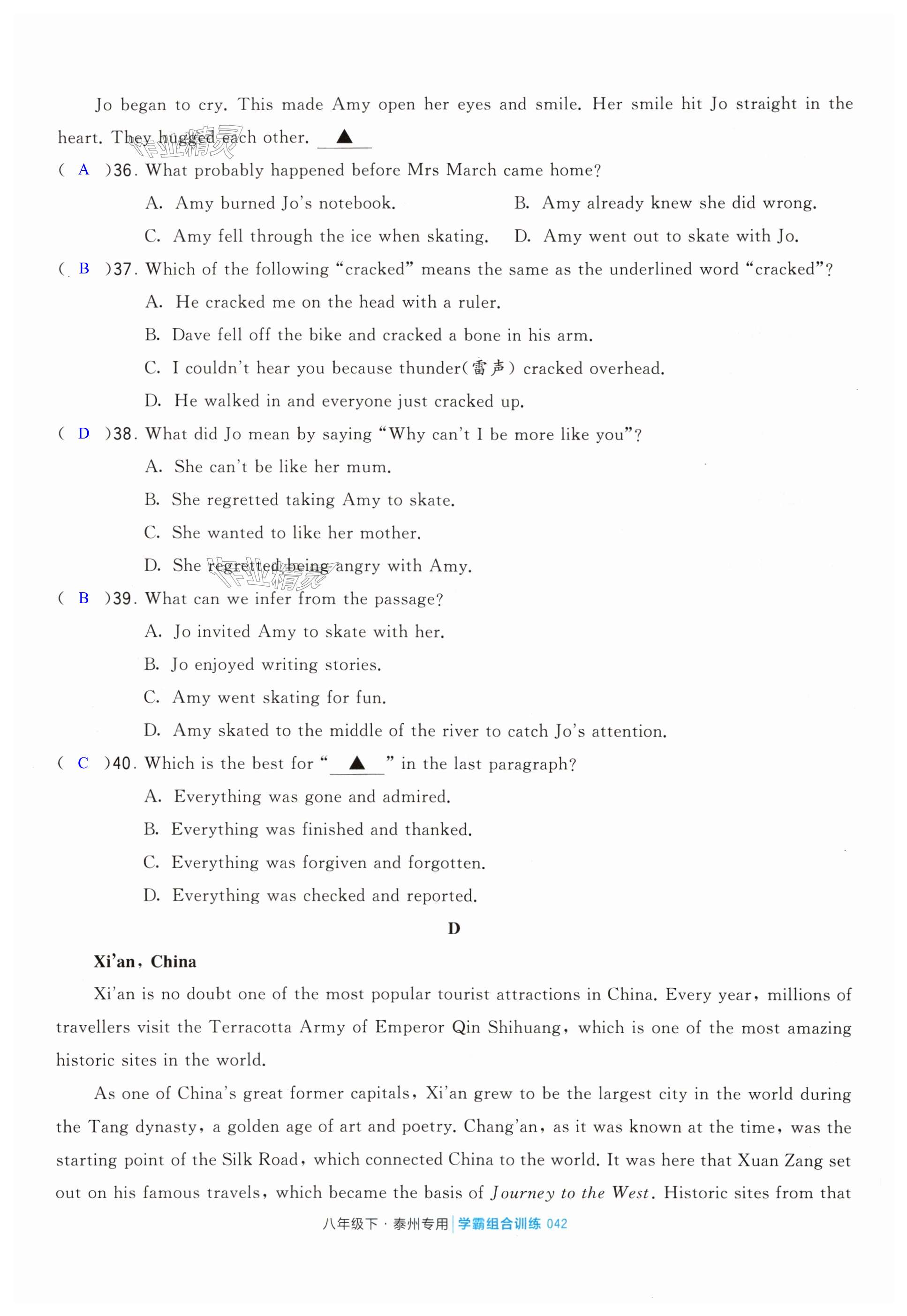注:目前有些书本章节名称可能整理的还不是很完善,但都是按照顺序排列的,请同学们按照顺序仔细查找。练习册 2024年学霸组合训练八年级英语下册译林版泰州专版 答案主要是用来给同学们做完题方便对答案用的,请勿直接抄袭。