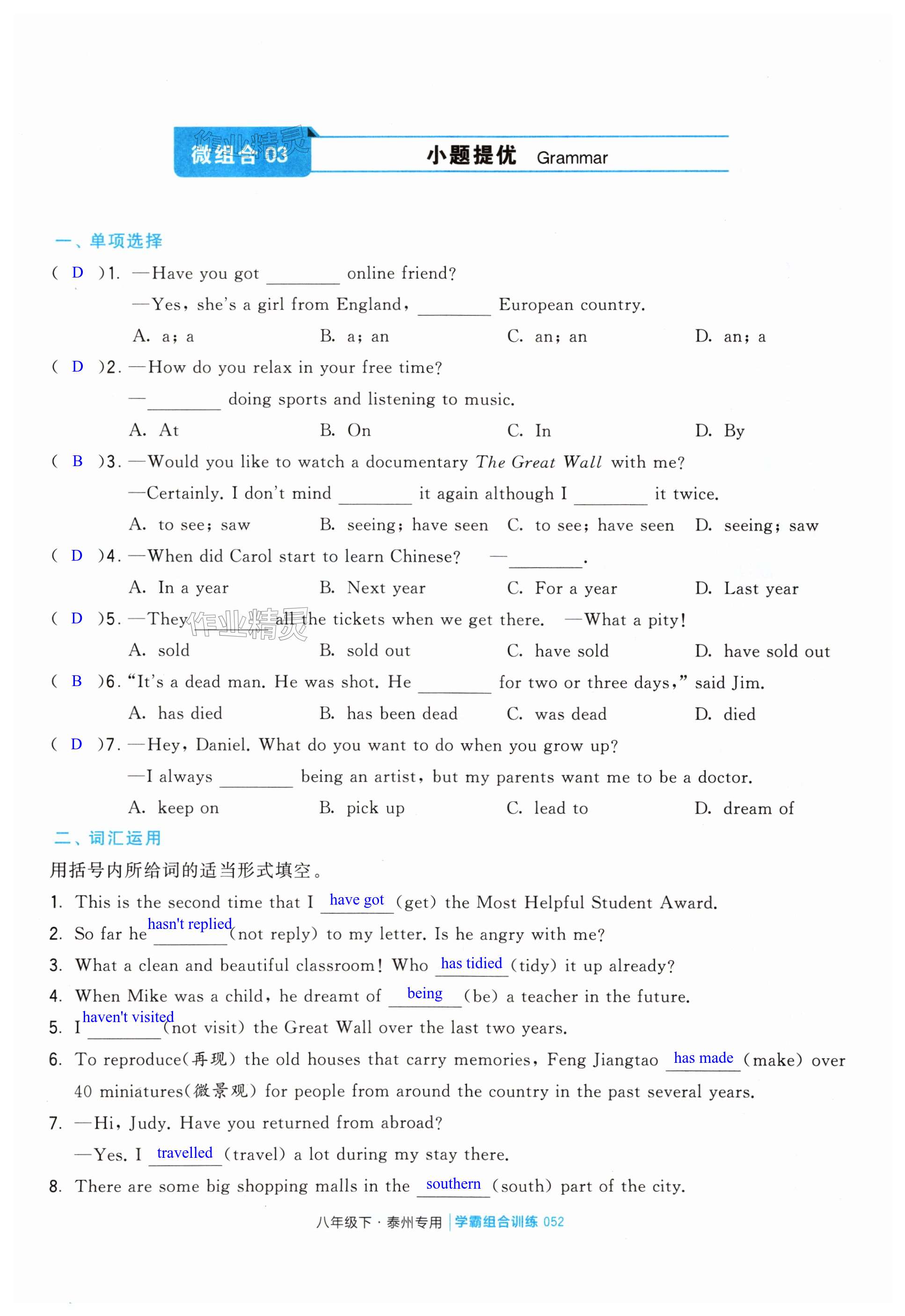 注:目前有些书本章节名称可能整理的还不是很完善,但都是按照顺序排列的,请同学们按照顺序仔细查找。练习册 2024年学霸组合训练八年级英语下册译林版泰州专版 答案主要是用来给同学们做完题方便对答案用的,请勿直接抄袭。