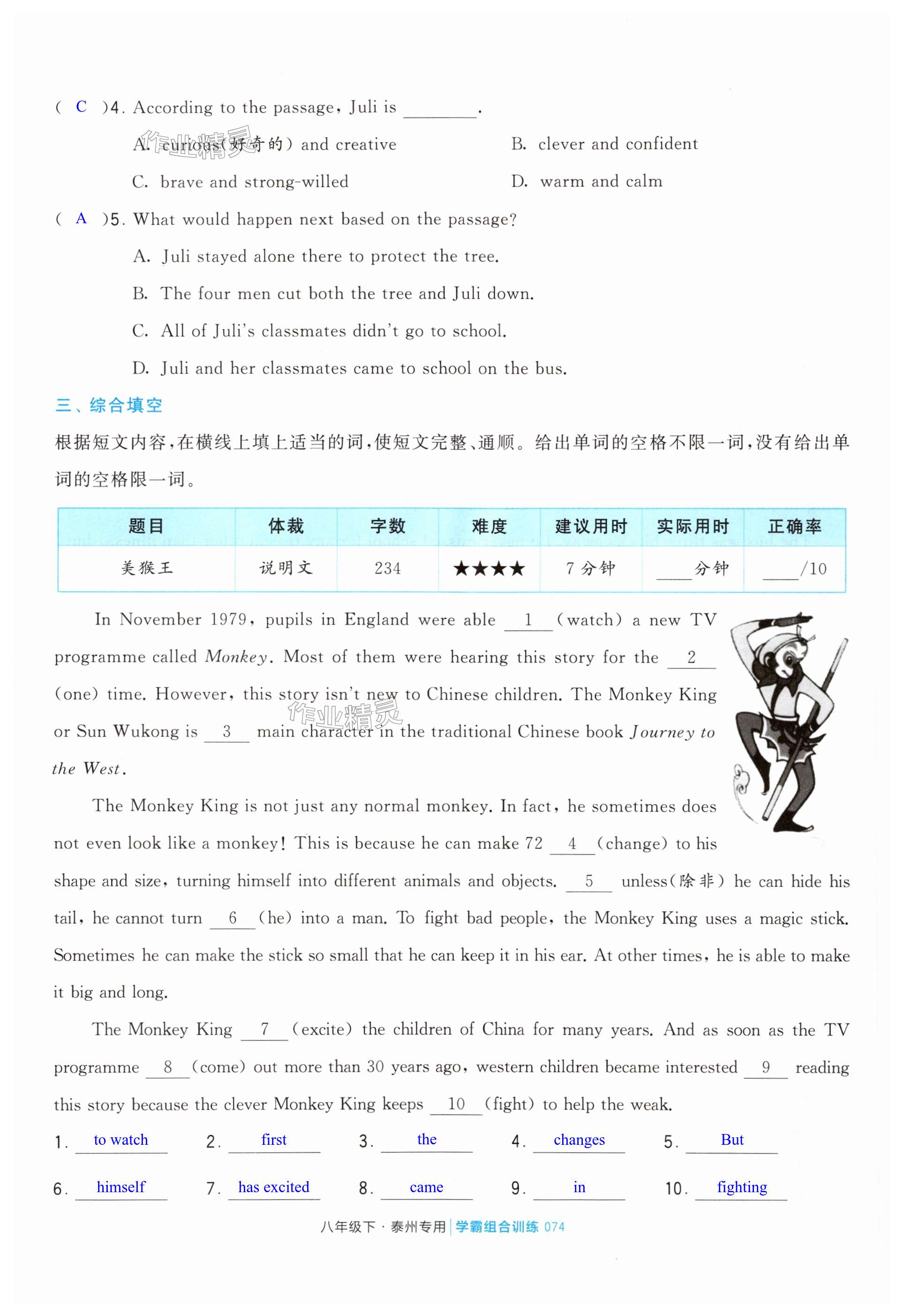 注:目前有些书本章节名称可能整理的还不是很完善,但都是按照顺序排列的,请同学们按照顺序仔细查找。练习册 2024年学霸组合训练八年级英语下册译林版泰州专版 答案主要是用来给同学们做完题方便对答案用的,请勿直接抄袭。