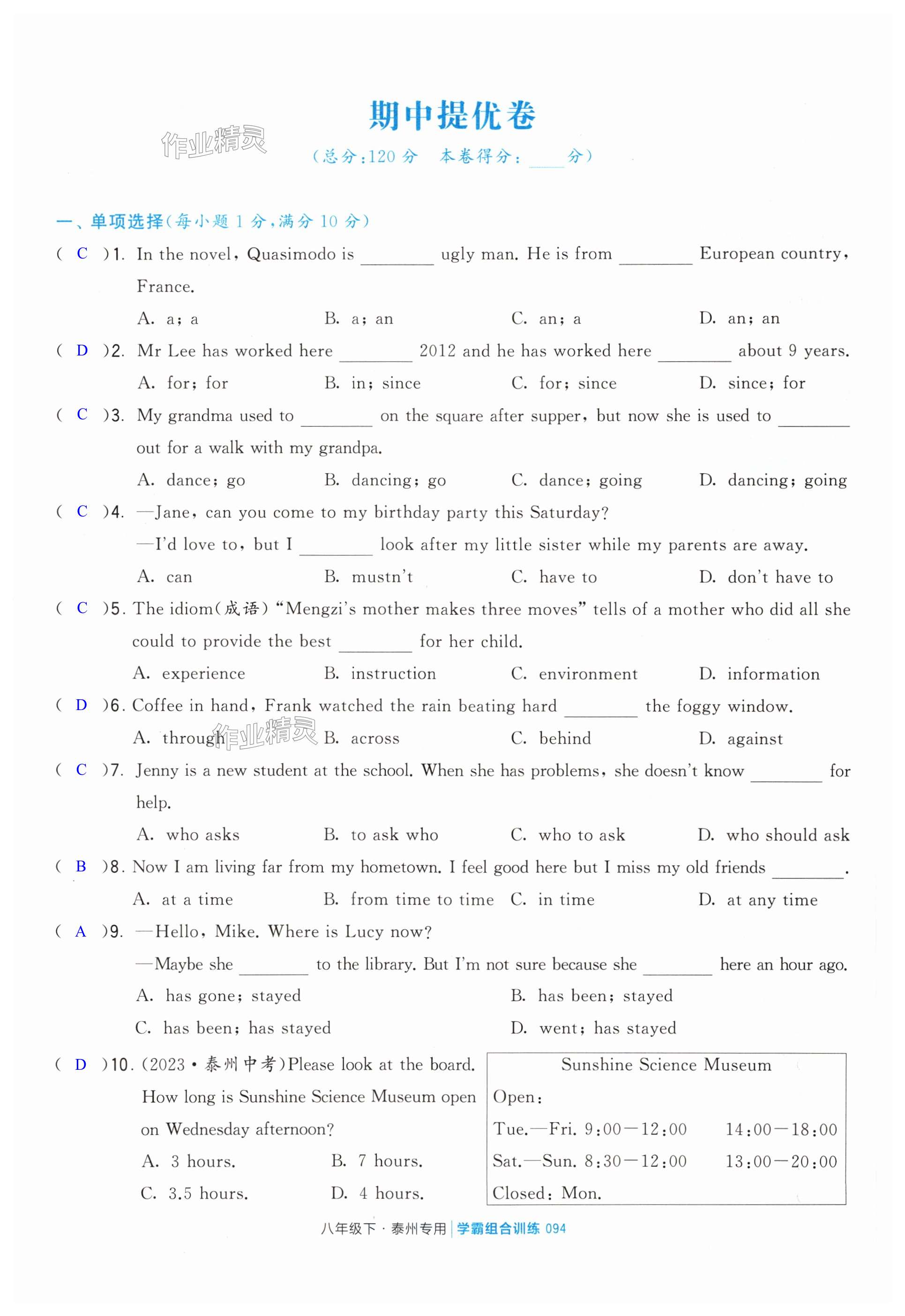 注:目前有些书本章节名称可能整理的还不是很完善,但都是按照顺序排列的,请同学们按照顺序仔细查找。练习册 2024年学霸组合训练八年级英语下册译林版泰州专版 答案主要是用来给同学们做完题方便对答案用的,请勿直接抄袭。