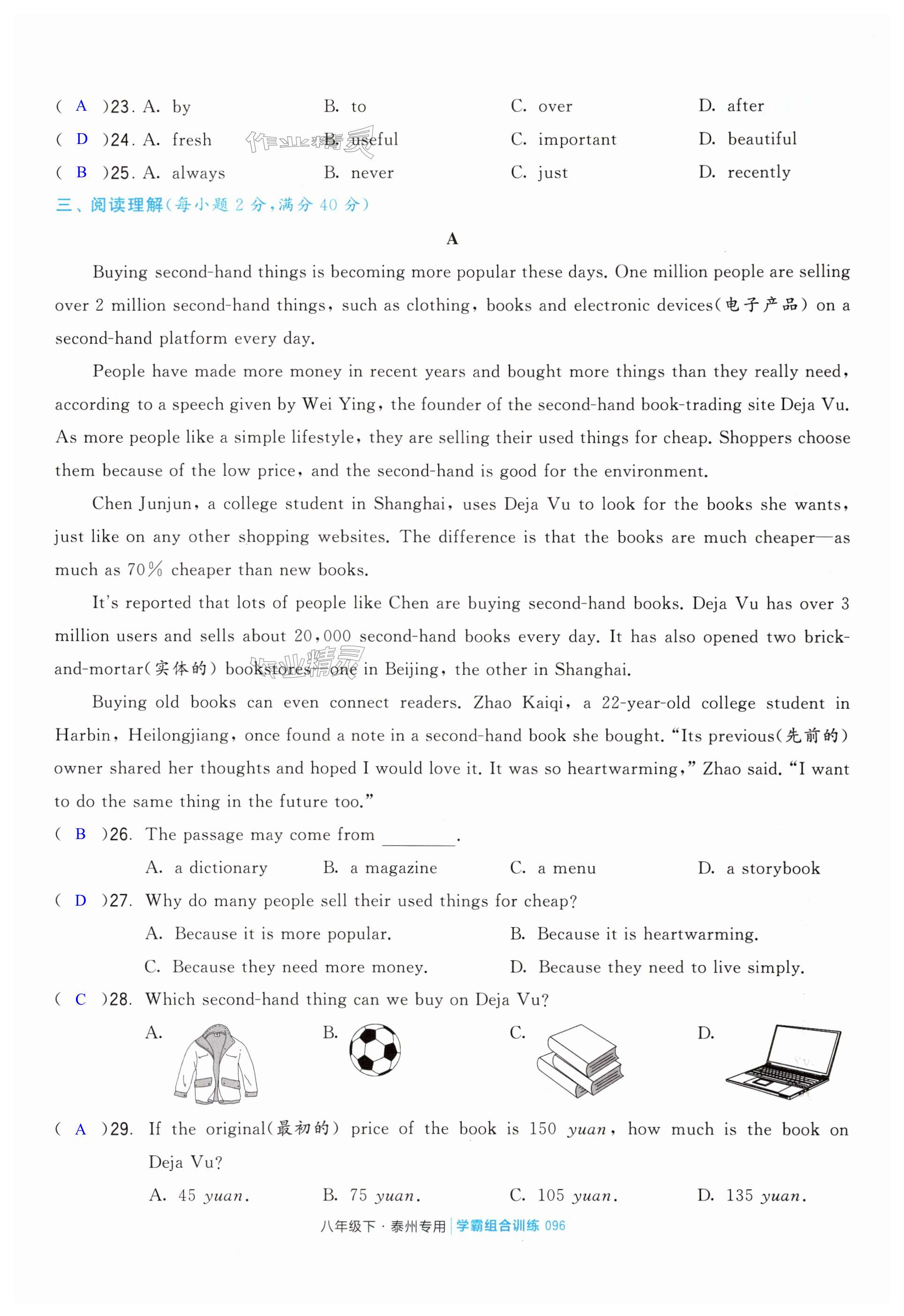 注:目前有些书本章节名称可能整理的还不是很完善,但都是按照顺序排列的,请同学们按照顺序仔细查找。练习册 2024年学霸组合训练八年级英语下册译林版泰州专版 答案主要是用来给同学们做完题方便对答案用的,请勿直接抄袭。