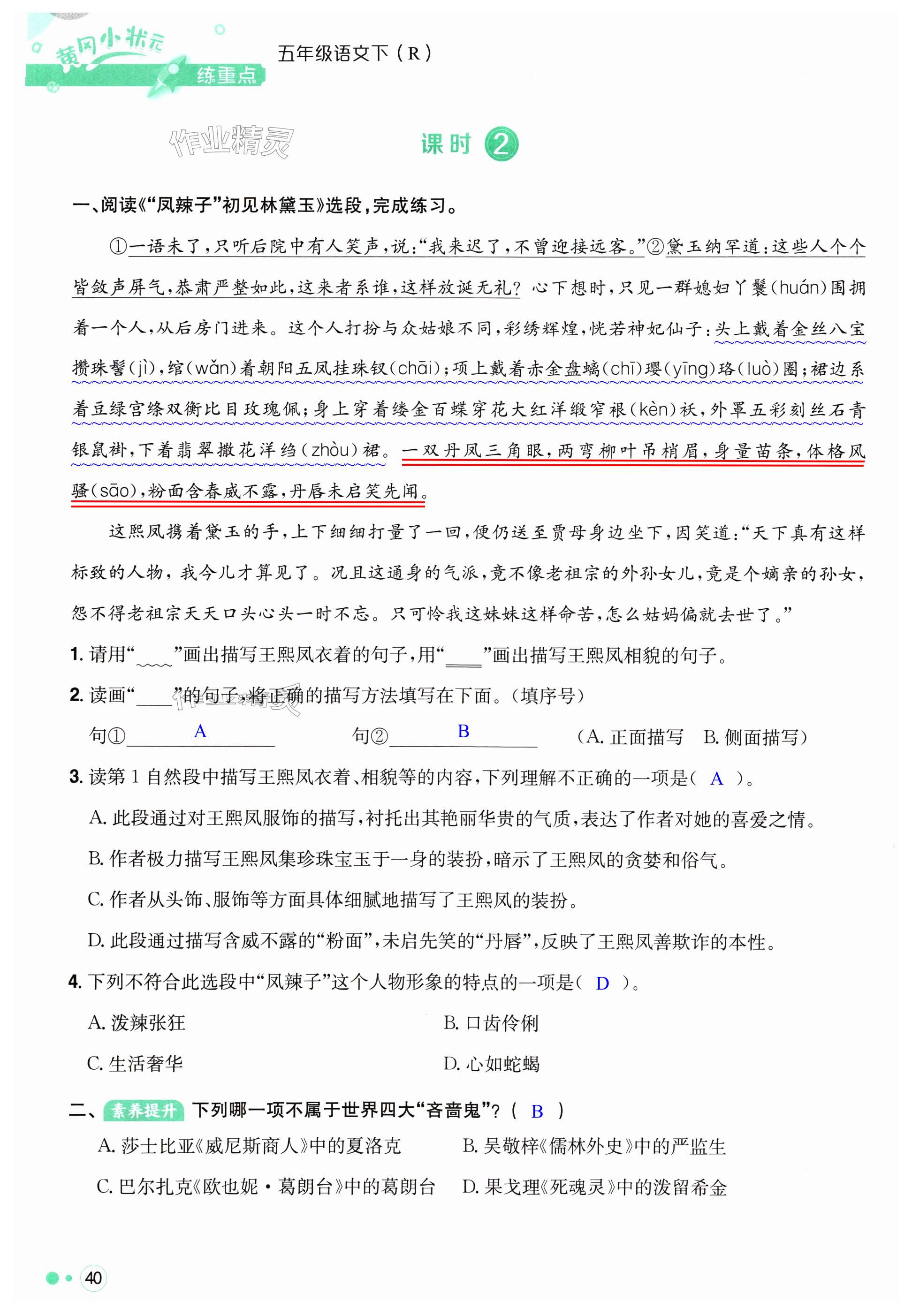 注:目前有些书本章节名称可能整理的还不是很完善,但都是按照顺序排列的,请同学们按照顺序仔细查找。练习册 2024年黄冈小状元练重点五年级语文下册人教版 答案主要是用来给同学们做完题方便对答案用的,请勿直接抄袭。