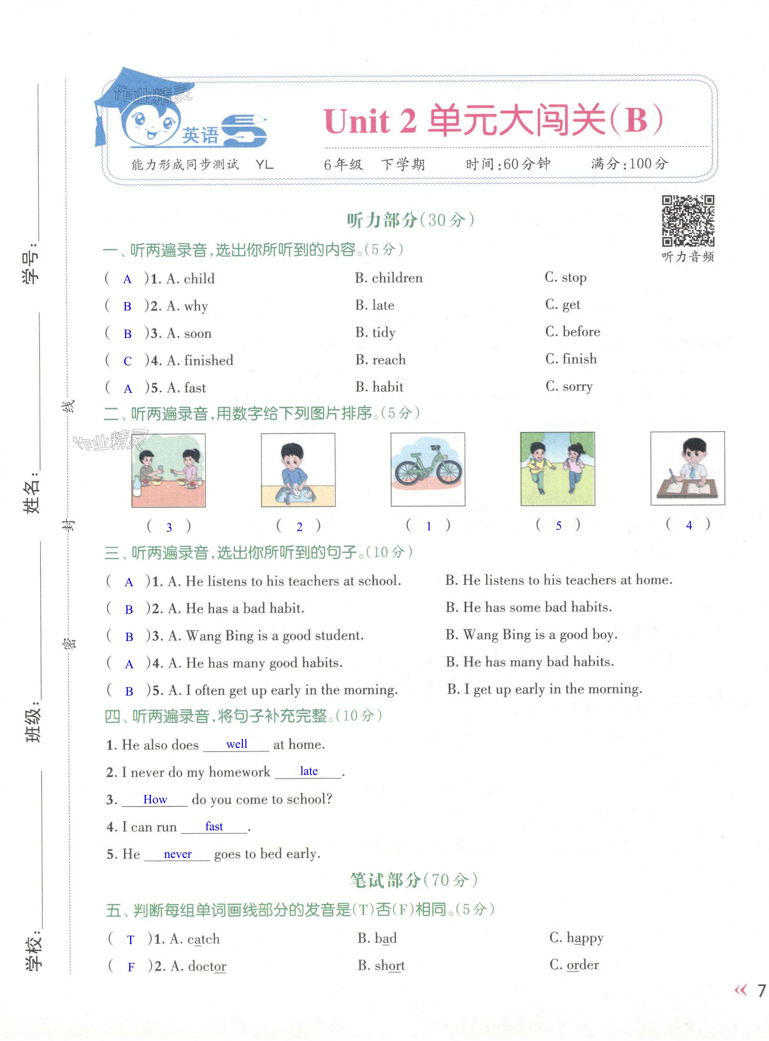 注:目前有些书本章节名称可能整理的还不是很完善,但都是按照顺序排列的,请同学们按照顺序仔细查找。练习册 2024年能力形成同步测试六年级英语下册译林版 答案主要是用来给同学们做完题方便对答案用的,请勿直接抄袭。